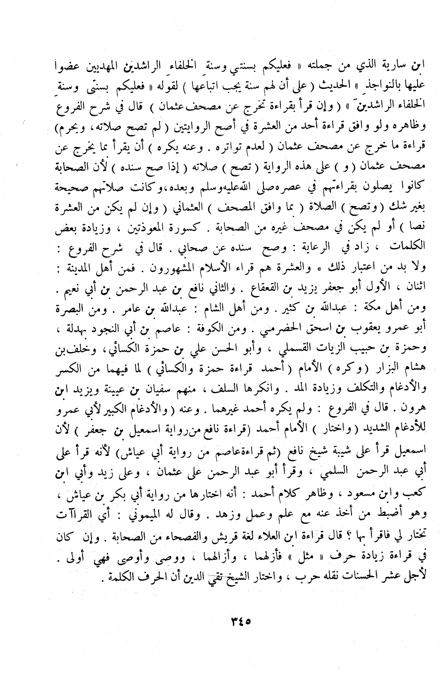بْنِ سَارِيَةَ الَّذِي مِنْ " جُمْلَتِهِ «فَعَلَيْكُمْ بِسُنَّتِي وَسُنَّةِ الْخُلَفَاءِ الرَّاشِدِينَ الْمَهْدِيِّينَ عُضُّوا عَلَيْهَا بِالنَّوَاجِذِ» الْحَدِيثَ (عَلَى أَنَّ لَهُمْ سُنَّةً يَجِبُ اتِّبَاعُهَا) لِقَوْلِهِ «فَعَلَيْكُمْ بِسُنَّتِي وَسُنَّةِ الْخُلَفَاءِ الرَّاشِدِينَ» (وَإِنْ قَرَأَ بِقِرَاءَةٍ تَخْرُجُ عَنْ مُصْحَفِ عُثْمَانَ) .