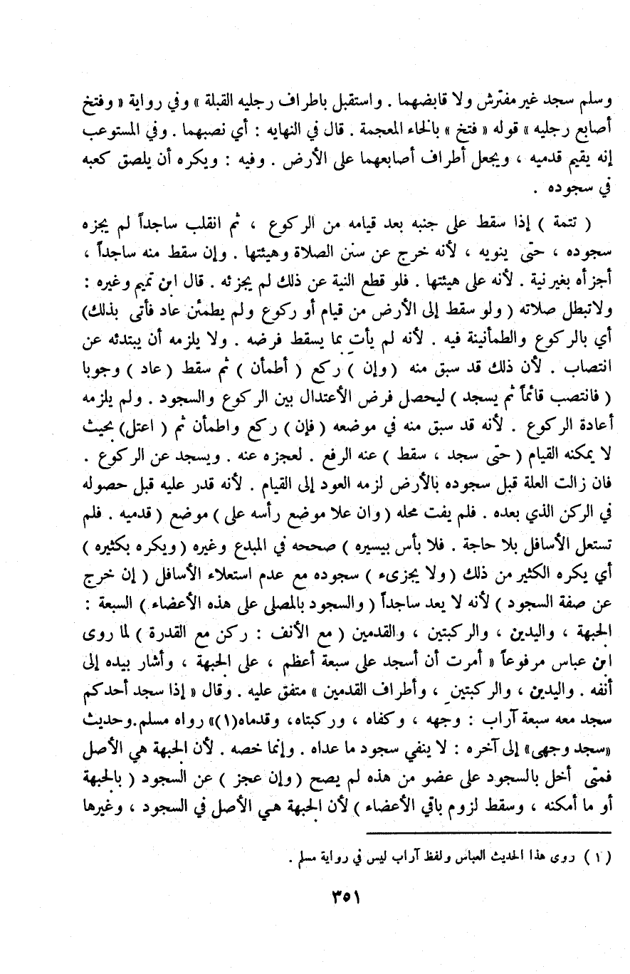 (وَيُكْرَهُ بِكَثِيرِهِ) أَيْ: يُكْرَهُ الْكَثِيرُ مِنْ ذَلِكَ (وَلَا يُجْزِئُ) سُجُودُهُ مَعَ عَدَمِ اسْتِعْلَاءِ الْأَسَافِلِ (إنْ خَرَجَ عَنْ صِفَةِ السُّجُودِ) لِأَنَّهُ لَا يُعَدُّ سَاجِدًا (وَالسُّجُودُ بِالْمُصَلِّي عَلَى هَذِهِ الْأَعْضَاءِ) السَّبْعَةِ: الْجَبْهَةِ، وَالْيَدَيْنِ، وَالرُّكْبَتَيْنِ، وَالْقَدَمَيْنِ (مَعَ الْأَنْفِ: رُكْنٌ مَعَ الْقُدْرَةِ) لِمَا رَوَى ابْنُ عَبَّاسٍ مَرْفُوعًا «أُمِرْتُ أَنْ أَسْجُدَ عَلَى سَبْعَةِ أَعْظُمٍ، عَلَى الْجَبْهَةِ، وَأَشَارَ بِيَدِهِ إلَى أَنْفِهِ وَالْيَدَيْنِ، وَالرُّكْبَتَيْنِ، وَأَطْرَافِ الْقَدَمَيْنِ» مُتَّفَقٌ عَلَيْهِ، وَقَالَ «إذَا سَجَدَ أَحَدُكُمْ سَجَدَ مَعَهُ سَبْعَةُ آرَابٍ: وَجْهُهُ، وَكَفَّاهُ، وَرُكْبَتَاهُ، وَقَدَمَاهُ» رَوَاهُ مُسْلِمٌ وَحَدِيثُ " سَجَدَ وَجْهِي " إلَى آخِرِهِ: لَا يَنْفِي سُجُودَ مَا عَدَاهُ وَإِنَّمَا خَصَّهُ لِأَنَّ الْجَبْهَةَ هِيَ الْأَصْلُ فَمَتَى أَخَلَّ بِالسُّجُودِ عَلَى عُضْوٍ مِنْ هَذِهِ لَمْ يَصِحَّ.