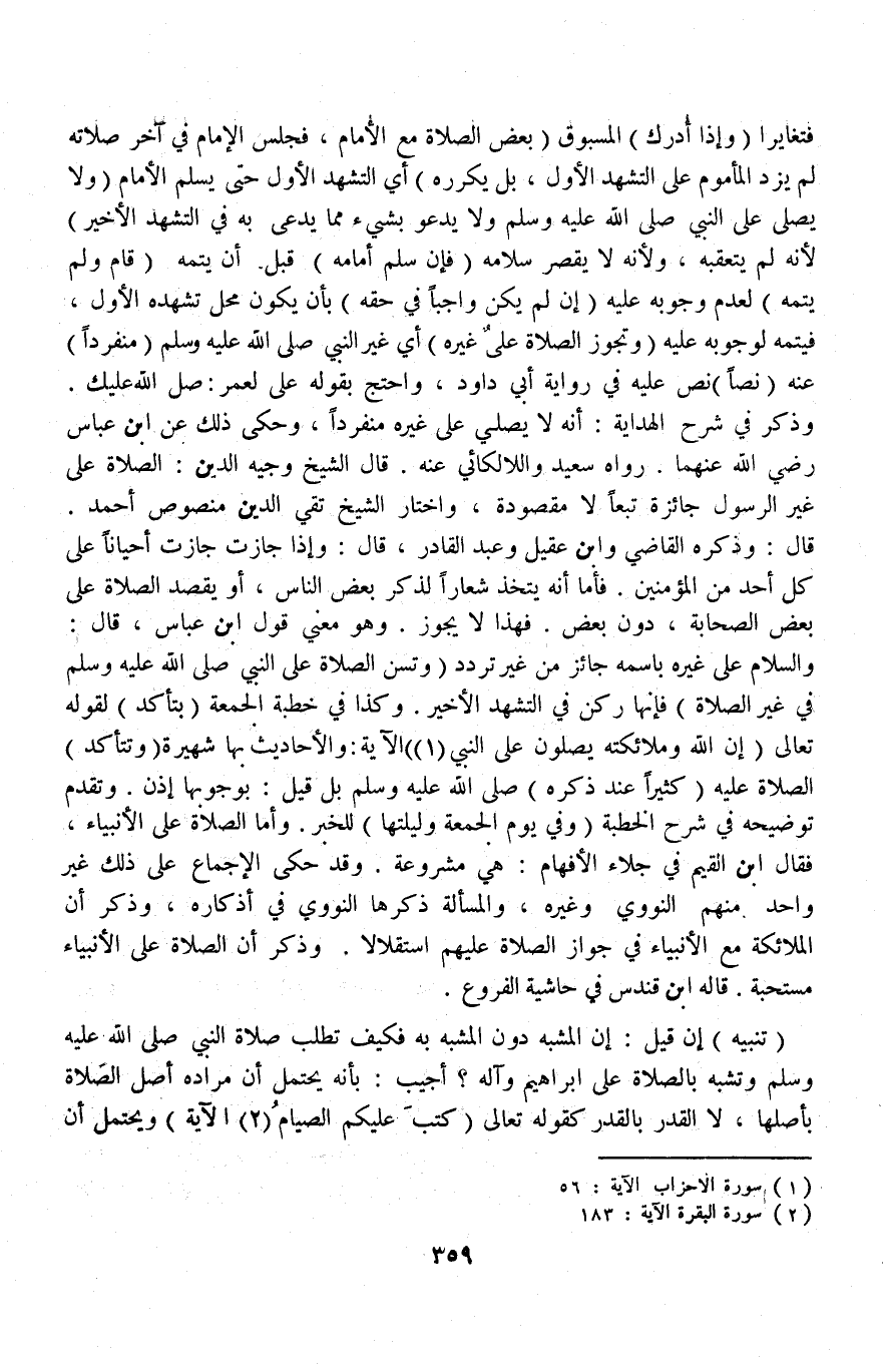 (تَنْبِيهٌ) إنْ قِيلَ إنَّ الْمُشَبَّهَ دُونَ الْمُشَبَّهِ بِهِ فَكَيْفَ تَطْلُبُ صَلَاةَ النَّبِيِّ - صَلَّى اللَّهُ عَلَيْهِ وَسَلَّمَ - وَتُشْبِهُ بِالصَّلَاةِ عَلَى إبْرَاهِيمَ وَآلِهِ؟ أُجِيبُ: بِأَنَّهُ يُحْتَمَلُ أَنَّ مُرَادَهُ أَصْلُ الصَّلَاةِ بِأَصْلِهَا، لَا الْقَدْرُ بِالْقَدْرِ كَقَوْلِهِ تَعَالَى {كُتِبَ عَلَيْكُمُ الصِّيَامُ} [البقرة: ١٨٣] الْآيَةَ) وَيُحْتَمَلُ أَنَّ