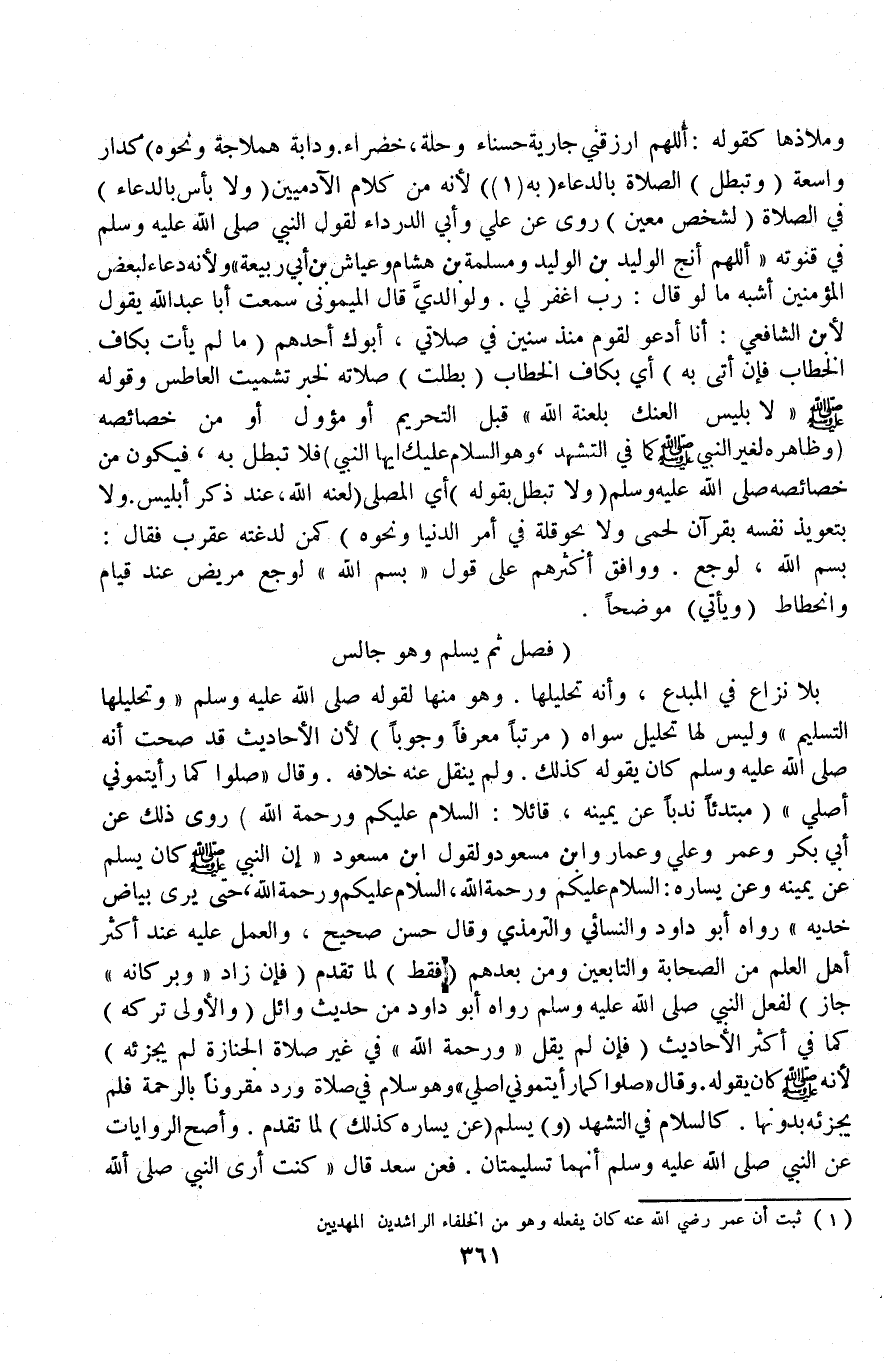 (فَصْل ثُمَّ يُسَلِّمُ وَهُوَ جَالِسٌ) بِلَا نِزَاعٍ فِي الْمُبْدِعِ، وَأَنَّهُ تَحْلِيلُهَا وَهُوَ مِنْهَا لِقَوْلِهِ - صَلَّى اللَّهُ عَلَيْهِ وَسَلَّمَ - «وَتَحْلِيلُهَا التَّسْلِيمُ» وَلَيْسَ لَهَا تَحْلِيلٌ سِوَاهُ (مُرَتَّبًا مُعَرَّفًا وُجُوبًا) لِأَنَّ الْأَحَادِيثَ قَدْ صَحَّتْ، أَنَّهُ - صَلَّى اللَّهُ عَلَيْهِ وَسَلَّمَ - كَانَ يَقُولُهُ كَذَلِكَ وَلَمْ يُنْقَلْ عَنْهُ خِلَافُهُ وَقَالَ «صَلُّوا كَمَا رَأَيْتُمُونِي أُصَلِّي» (مُبْتَدِئًا نَدْبًا عَنْ يَمِينِهِ، قَائِلًا: السَّلَامُ عَلَيْكُمْ وَرَحْمَةُ اللَّهِ) رُوِيَ ذَلِكَ عَنْ أَبِي بَكْرٍ وَعُمَرَ وَعَلِيٍّ وَعَمَّارٍ وَابْنِ مَسْعُودٍ وَلِقَوْلِ ابْنِ مَسْعُودٍ «إنَّ النَّبِيَّ - صَلَّى اللَّهُ عَلَيْهِ وَسَلَّمَ - كَانَ يُسَلِّمُ عَنْ يَمِينِهِ وَعَنْ يَسَارِهِ: السَّلَامُ عَلَيْكُمْ وَرَحْمَةُ اللَّهِ، السَّلَامُ عَلَيْكُمْ وَرَحْمَةُ اللَّهِ حَتَّى يُرَى بَيَاضُ خَدَّيْهِ» رَوَاهُ أَبُو دَاوُد وَالنَّسَائِيُّ وَالتِّرْمِذِيُّ وَقَالَ حَسَنٌ صَحِيحٌ وَالْعَمَلُ عَلَيْهِ عِنْدَ أَكْثَرِ أَهْلِ الْعِلْمِ مِنْ الصَّحَابَةِ وَالتَّابِعِينَ وَمَنْ بَعْدَهُمْ (فَقَطْ) لِمَا تَقَدَّمَ.