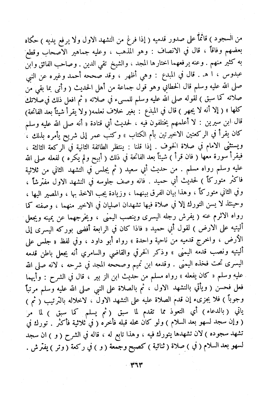 وَفِي لَفْظِهِ «جَلَسَ عَلَى أَلْيَتَيْهِ وَنَصَبَ قَدَمَهُ الْيُمْنَى» وَذَكَرَ الْخِرَقِيُّ وَالْقَاضِي وَالسَّامِرِيُّ أَنَّهُ يَجْعَلُ بَاطِنَ قَدَمِهِ الْيُسْرَى تَحْتَ فَخِذِهِ الْيُمْنَى وَقَدَّمَهُ ابْنُ تَمِيمٍ وَصَحَّحَهُ الْمَجْدُ فِي شَرْحِهِ، لِأَنَّهُ - صَلَّى اللَّهُ عَلَيْهِ وَسَلَّمَ - كَانَ يَفْعَلُهُ رَوَاهُ مُسْلِمٌ مِنْ حَدِيثِ ابْنِ الزُّبَيْرِ قَالَ فِي الشَّرْحِ: وَأَيَّهمَا فَعَلَ فَحَسَنٌ.