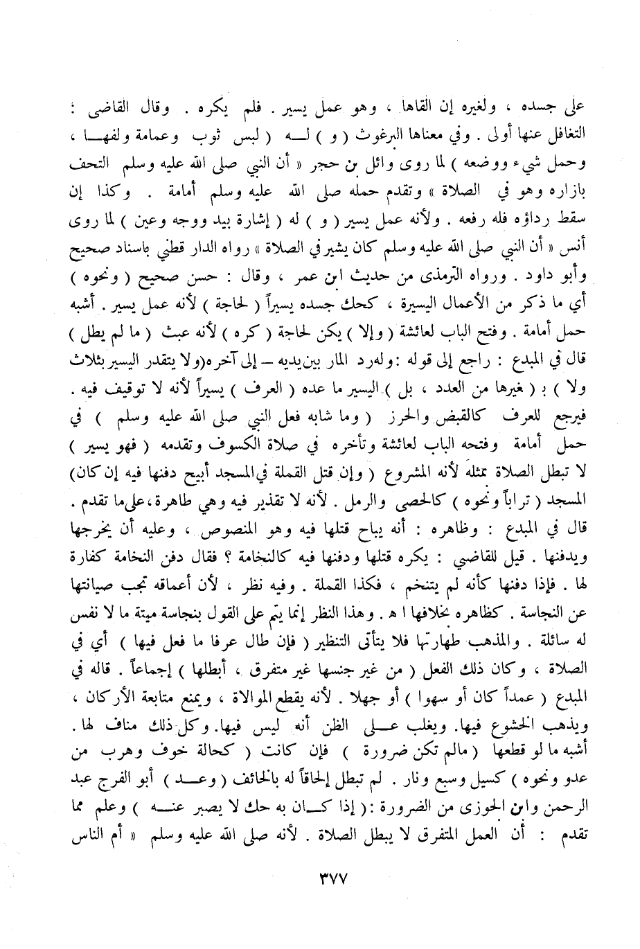(وَإِلَّا) يَكُنْ لِحَاجَةٍ (كُرِهَ) لِأَنَّهُ عَبَثٌ (مَا لَمْ يَطُلْ) قَالَ فِي الْمُبْدِعِ: رَاجِعٌ إلَى قَوْلِهِ: وَلَهُ رَدُّ الْمَارِّ بَيْنَ يَدَيْهِ إلَى آخِرِهِ (وَلَا يَتَقَدَّرُ الْيَسِيرُ بِثَلَاثٍ وَلَا) بِ (غَيْرِهَا مِنْ الْعَدَدِ، بَلْ) الْيَسِيرُ مَا عَدَّهُ (الْعُرْفُ) يَسِيرًا لِأَنَّهُ لَا تَوْقِيفَ فِيهِ فَيَرْجِعُ لِلْعُرْفِ كَالْقَبْضِ وَالْحِرْزِ (وَمَا شَابَهَ فِعْلَ النَّبِيِّ - صَلَّى اللَّهُ عَلَيْهِ وَسَلَّمَ -) فِي حَمْلِ أُمَامَةَ وَفَتْحِهِ الْبَابَ لِعَائِشَةَ وَتَأَخُّرِهِ فِي صَلَاةِ الْكُسُوفِ وَتَقَدُّمِهِ (فَهُوَ يَسِيرٌ) لَا تَبْطُلُ الصَّلَاةُ بِمِثْلِهِ لِأَنَّهُ الْمَشْرُوعُ.