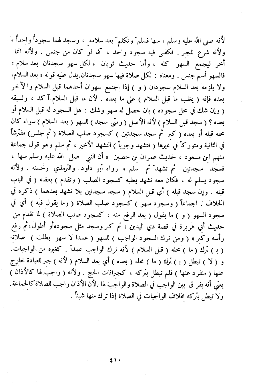 وَ (لَا) تَبْطُلُ (بِ) تَرْكِ (مَا) مَحَلُّهُ (بَعْدَهُ) أَيْ بَعْدَ السَّلَامِ؛ لِأَنَّهُ جَبْرٌ لِلْعِبَادَةِ خَارِجٌ عَنْهَا (مُنْفَرِدٌ عَنْهَا) فَلَمْ تَبْطُلُ بِتَرْكِهِ، كَجُبْرَانَاتِ الْحَجِّ وَلِأَنَّهُ (وَاجِبٌ لَهَا كَالْأَذَانِ) يَعْنِي أَنَّهُ يُفَرَّقُ بَيْنَ الْوَاجِبِ فِي الصَّلَاةِ وَالْوَاجِبِ لَهَا؛ لِأَنَّ الْأَذَانَ وَاجِبٌ لِلصَّلَاةِ كَالْجَمَاعَةِ وَلَا تَبْطُلُ بِتَرْكِهِ بِخِلَافِ الْوَاجِبَاتِ فِي الصَّلَاةِ إذَا تَرَكَ مِنْهَا شَيْئًا.