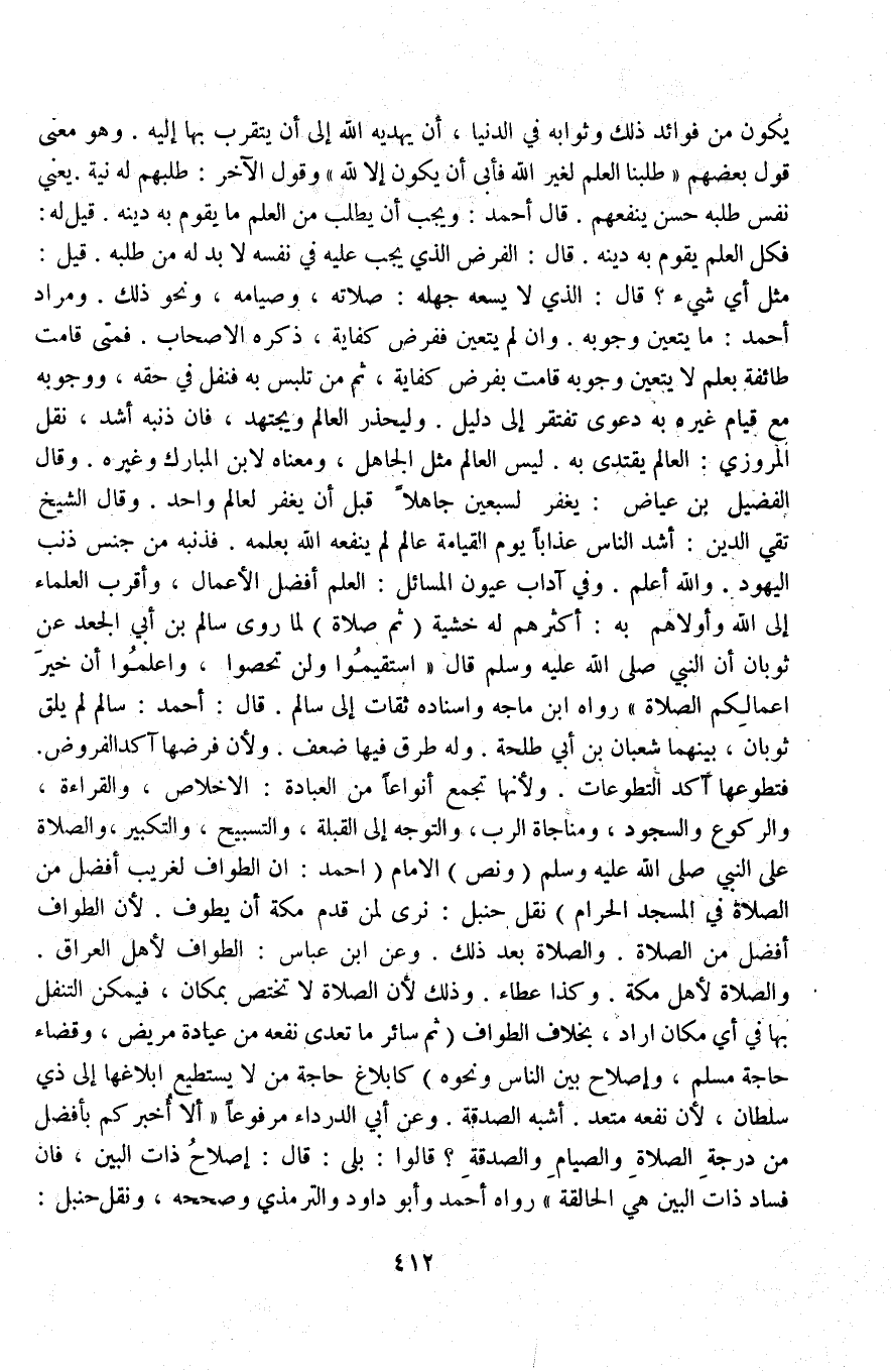 قَالَ أَحْمَدُ وَيَجِبُ أَنْ يَطْلُبَ مِنْ الْعِلْمِ مَا يَقُومُ بِهِ دِينُهُ قِيلَ لَهُ: فَكُلُّ الْعِلْمِ يَقُومُ بِهِ دِينُهُ قَالَ: الْفَرْضُ الَّذِي يَجِبُ عَلَيْهِ فِي نَفْسِهِ لَا بُدَّ لَهُ مِنْ طَلَبِهِ قِيلَ: مِثْلُ أَيِّ شَيْءٍ؟ قَالَ: الَّذِي لَا يَسَعُهُ جَهْلُهُ: صَلَاتُهُ، وَصِيَامُهُ، وَنَحْوُ ذَلِكَ وَمُرَادُ أَحْمَدَ مَا يَتَعَيَّنُ وُجُوبُهُ وَإِنْ لَمْ يَتَعَيَّنْ فَفَرْضُ كِفَايَةٍ ذَكَرَهُ الْأَصْحَابُ فَمَتَى قَامَتْ طَائِفَةٌ بِعِلْمٍ لَا يَتَعَيَّنُ، وُجُوبُهُ قَامَتْ بِفَرْضِ كِفَايَةٍ ثُمَّ مَنْ تَلَبَّسَ بِهِ فَنَفْلٌ فِي حَقِّهِ، وَوُجُوبُهُ مَعَ قِيَامِ غَيْرِهِ بِهِ دَعْوَى تَفْتَقِرُ إلَى دَلِيلٍ وَلْيَحْذَرْ الْعَالِمُ وَيَجْتَهِدْ، فَإِنَّ ذَنْبَهُ أَشَدُّ نَقَلَ الْمَرْوَزِيُّ: الْعَالِمُ يُقْتَدَى بِهِ لَيْسَ الْعَالِمُ مِثْلَ الْجَاهِلِ، وَمَعْنَاهُ لِابْنِ الْمُبَارَكِ وَغَيْرِهِ وَقَالَ الْفُضَيْلُ بْنُ عِيَاضٍ: يُغْفَرُ لِسَبْعِينَ جَاهِلًا قَبْلَ أَنْ يُغْفَرَ لِعَالِمٍ وَاحِدٍ وَقَالَ الشَّيْخُ تَقِيُّ الدِّينِ: أَشَدُّ النَّاسِ عَذَابًا يَوْمَ الْقِيَامَةِ عَالِمٌ لَمْ يَنْفَعْهُ اللَّهُ بِعِلْمِهِ فَذَنْبُهُ مِنْ جِنْسِ ذَنْبِ الْيَهُودِ وَاَللَّهُ أَعْلَمُ.