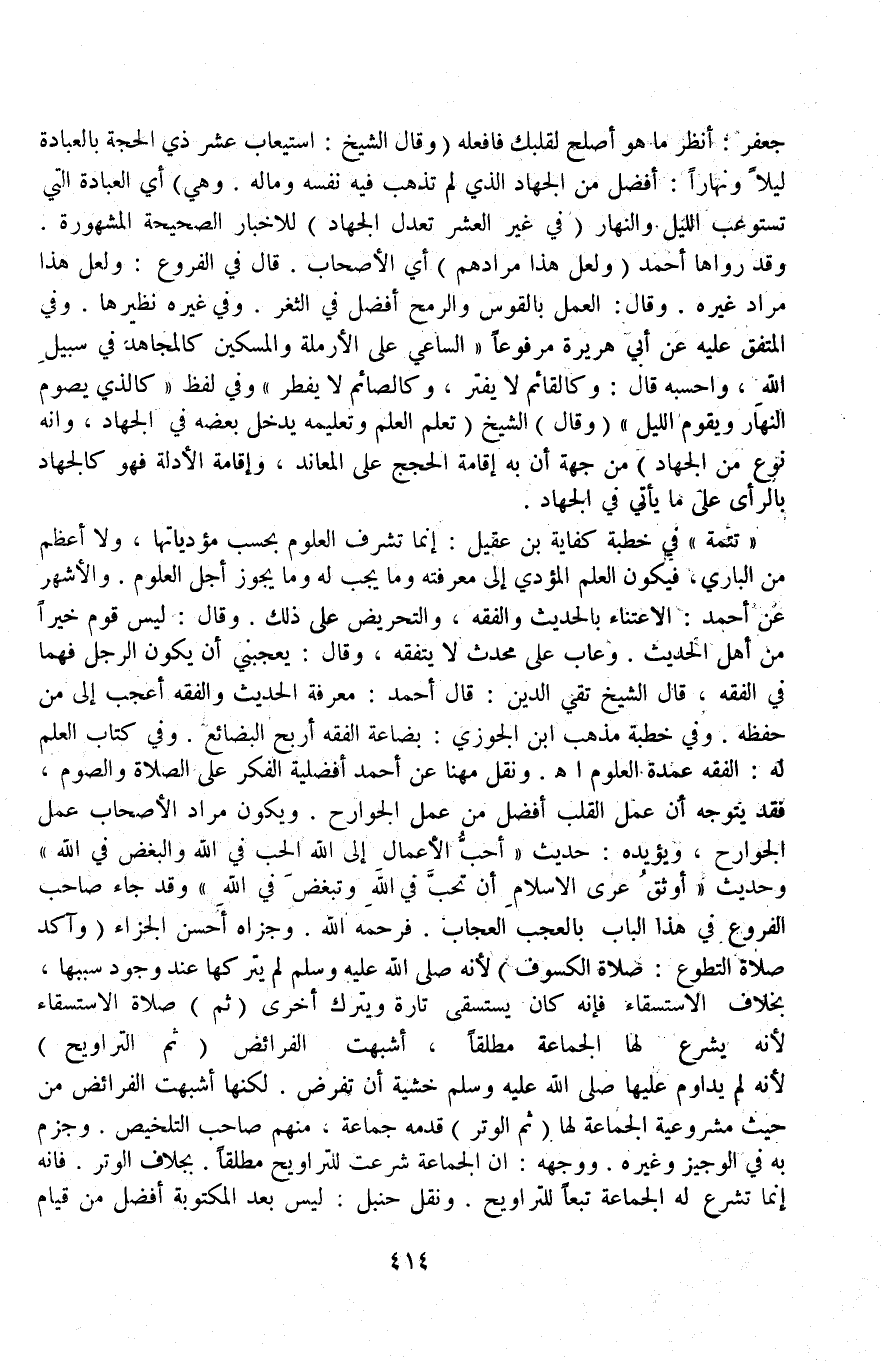 اُنْظُرْ مَا هُوَ أَصْلَحُ لِقَلْبِك فَافْعَلْهُ (وَقَالَ الشَّيْخُ: اسْتِيعَابُ عَشْرِ ذِي الْحِجَّةِ بِالْعِبَادَةِ لَيْلًا وَنَهَارًا: أَفْضَلُ مِنْ الْجِهَادِ الَّذِي لَمْ تَذْهَبْ فِيهِ نَفْسُهُ وَمَالُهُ وَهِيَ) أَيْ الْعِبَادَةُ الَّتِي تَسْتَوْعِبُ اللَّيْلَ وَالنَّهَارَ (فِي غَيْرِ الْعَشْرِ تَعْدِلُ الْجِهَادَ) لِلْأَخْبَارِ الصَّحِيحَةِ الْمَشْهُورَةِ.
