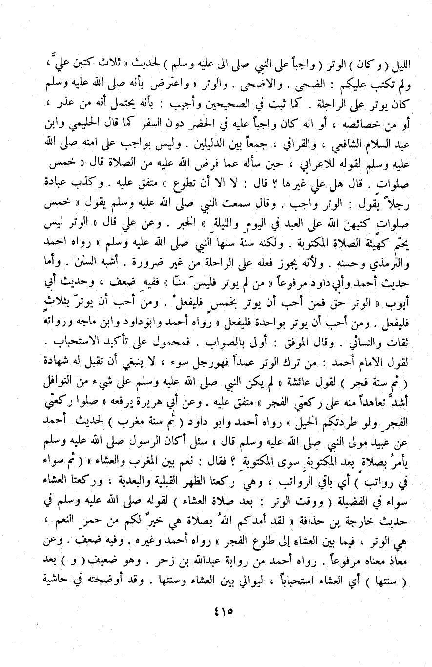 «وَعَنْ عَلِيٍّ قَالَ: الْوِتْرُ لَيْسَ بِحَتْمٍ كَهَيْئَةِ الصَّلَاةِ الْمَكْتُوبَةِ وَلَكِنَّهُ سُنَّةٌ سَنَّهَا النَّبِيُّ - صَلَّى اللَّهُ عَلَيْهِ وَسَلَّمَ -» رَوَاهُ أَحْمَدُ وَالتِّرْمِذِيُّ وَحَسَّنَهُ وَلِأَنَّهُ يَجُوزُ فِعْلُهُ عَلَى الرَّاحِلَةِ مِنْ غَيْرِ ضَرُورَةٍ أَشْبَهَ السُّنَنَ وَأَمَّا حَدِيثُ أَحْمَدَ وَأَبِي دَاوُد مَرْفُوعًا «مَنْ لَمْ يُوتِرْ فَلَيْسَ مِنَّا» فَفِيهِ ضَعْفٌ، وَحَدِيثُ أَبِي أَيُّوبَ «الْوِتْرُ حَقٌّ فَمَنْ أَحَبَّ أَنْ يُوتِرَ بِخَمْسٍ فَلْيَفْعَلْ وَمَنْ أَحَبَّ أَنْ يُوتِرَ بِثَلَاثٍ فَلْيَفْعَلْ وَمَنْ أَحَبَّ أَنْ يُوتِرَ بِوَاحِدَةٍ فَلْيَفْعَلْ» رَوَاهُ أَحْمَدُ وَأَبُو دَاوُد وَابْنُ مَاجَهْ وَرُوَاتُهُ ثِقَاتٌ وَالنَّسَائِيُّ.