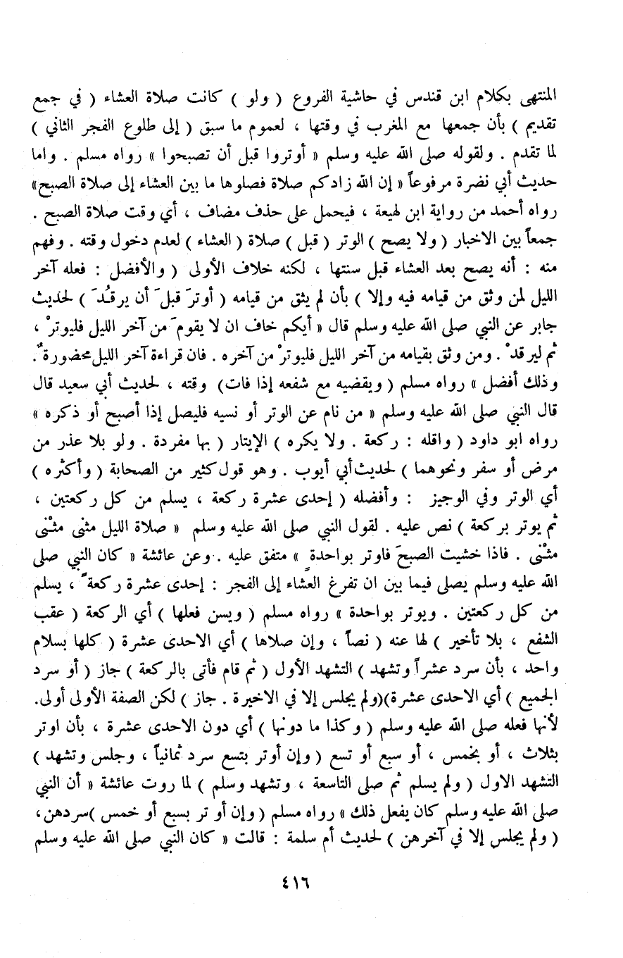 وَعَنْ عَائِشَةَ «كَانَ النَّبِيُّ - صَلَّى اللَّهُ عَلَيْهِ وَسَلَّمَ - يُصَلِّي فِيمَا بَيْنَ أَنْ تَفْرُغَ الْعِشَاءُ إلَى الْفَجْرِ: إحْدَى عَشْرَةَ رَكْعَةً، يُسَلِّمُ مِنْ كُلِّ رَكْعَتَيْنِ وَيُوتِرُ بِوَاحِدَةٍ» رَوَاهُ مُسْلِمٌ (وَيُسَنُّ فِعْلُهَا) أَيْ الرَّكْعَةِ (عَقِبَ الشَّفْعِ، بِلَا تَأْخِيرٍ) لَهَا عَنْهُ (نَصًّا، وَإِنْ صَلَّاهَا) أَيْ الْإِحْدَى عَشْرَةَ (كُلَّهَا بِسَلَامٍ وَاحِدٍ بِأَنْ سَرَدَ عَشْرًا وَتَشَهَّدَ) التَّشَهُّدَ الْأَوَّلَ (ثُمَّ قَامَ فَأَتَى بِالرَّكْعَةِ) جَازَ (أَوْ سَرَدَ الْجَمِيعَ) أَيْ الْإِحْدَى عَشْرَةَ (وَلَمْ يَجْلِسْ إلَّا فِي الْأَخِيرَةِ جَازَ) لَكِنْ الصِّفَةُ الْأُولَى أَوْلَى.