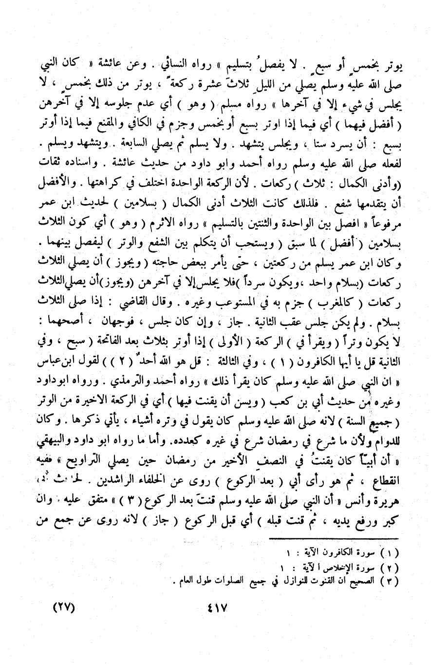 وَلَا يُسَلِّمُ ثُمَّ يُصَلِّي السَّابِعَةَ وَيَتَشَهَّدُ وَيُسَلِّمُ لِفِعْلِهِ - صَلَّى اللَّهُ عَلَيْهِ وَسَلَّمَ - رَوَاهُ أَحْمَدُ وَأَبُو دَاوُد مِنْ حَدِيثِ عَائِشَةَ وَإِسْنَادُهُ ثِقَاتٌ (وَأَدْنَى الْكَمَالِ: ثَلَاثُ) رَكَعَاتٍ؛ لِأَنَّ الرَّكْعَةَ الْوَاحِدَةَ اُخْتُلِفَ فِي كَرَاهَتِهَا وَالْأَفْضَلُ أَنْ يَتَقَدَّمَهَا شَفْعٌ فَلِذَلِكَ كَانَتْ الثَّلَاثُ أَدْنَى الْكَمَالِ (بِسَلَامَيْنِ) لِحَدِيثِ ابْنِ عُمَرَ مَرْفُوعًا «افْصِلْ بَيْنَ الْوَاحِدَةِ وَالثِّنْتَيْنِ بِالتَّسْلِيمِ» رَوَاهُ الْأَثْرَمُ (وَهُوَ) أَيْ كَوْنُ الثَّلَاثِ بِسَلَامَيْنِ (أَفْضَلَ) لِمَا سَبَقَ (وَيُسْتَحَبُّ أَنْ يَتَكَلَّمَ بَيْنَ الشَّفْعِ وَالْوَتْرِ) لِيَفْصِلَ بَيْنَهُمَا وَكَانَ ابْنُ عُمَرَ يُسَلِّمُ مِنْ رَكْعَتَيْنِ، حَتَّى يَأْمُرَ بِبَعْضِ حَاجَتِهِ (وَيَجُوزُ) أَنْ يُصَلِّيَ الثَّلَاثَ رَكَعَاتٍ (بِسَلَامٍ وَاحِدٍ وَيَكُونُ سَرْدًا) فَلَا يَجْلِسُ إلَّا فِي آخِرِهِنَّ (وَيَجُوزُ) أَنْ يُصَلِّيَ الثَّلَاثَ رَكَعَاتٍ (كَالْمَغْرِبِ) جَزَمَ بِهِ فِي الْمُسْتَوْعِبِ وَغَيْرِهِ وَقَالَ الْقَاضِي إذَا صَلَّى الثَّلَاثَ بِسَلَامٍ وَلَمْ يَكُنْ جَلَسَ عَقِبَ الثَّانِيَةِ جَازَ، وَإِنْ كَانَ جَلَسَ، فَوَجْهَانِ، أَصَحُّهُمَا: لَا يَكُونُ وِتْرًا (وَيَقْرَأُ فِي) الرَّكْعَةِ (الْأُولَى) إذَا أَوْتَرَ بِثَلَاثٍ بَعْدَ الْفَاتِحَةِ (سَبِّحْ وَفِي الثَّانِيَةِ: " قُلْ يَا أَيُّهَا الْكَافِرُونَ ".