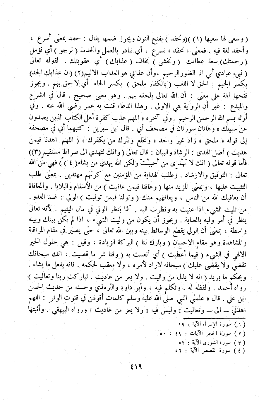 {وَسَعَى لَهَا سَعْيَهَا} [الإسراء: ١٩] (وَنَحْفِدُ) بِفَتْحِ النُّون وَيَجُوزُ ضَمُّهَا يُقَالُ: حَفَدَ بِمَعْنَى أَسْرَعَ، وَأَحْفَدَ لُغَةٌ فِيهِ فَمَعْنَى نَحْفِدُ نُسْرِعُ، أَيْ نُبَادِرُ بِالْعَمَلِ وَالْخِدْمَةِ (نَرْجُو) أَيْ نُؤَمِّلُ (رَحْمَتَك) سَعَةَ عَطَائِك (وَنَخْشَى) نَخَافُ (عَذَابَك) أَيْ عُقُوبَتَك لِقَوْلِهِ تَعَالَى {نَبِّئْ عِبَادِي أَنِّي أَنَا الْغَفُورُ الرَّحِيمُ} [الحجر: ٤٩] {وَأَنَّ عَذَابِي هُوَ الْعَذَابُ الأَلِيمُ} [الحجر: ٥٠] (إنَّ عَذَابَك الْجِدُّ) بِكَسْرِ الْجِيمِ: الْحَقُّ لَا اللَّعِبُ (بِالْكُفَّارِ مُلْحِقٌ) بِكَسْرِ الْحَاءِ أَيْ لَاحِقٌ بِهِمْ وَيَجُوزُ فَتْحُهَا لُغَةً عَلَى مَعْنَى: أَنَّ اللَّهَ تَعَالَى يُلْحِقُهُ بِهِمْ وَهُوَ مَعْنًى صَحِيحٌ قَالَ فِي الشَّرْحِ وَالْمُبْدِعِ: غَيْرَ أَنَّ الرِّوَايَةَ هِيَ الْأُولَى.