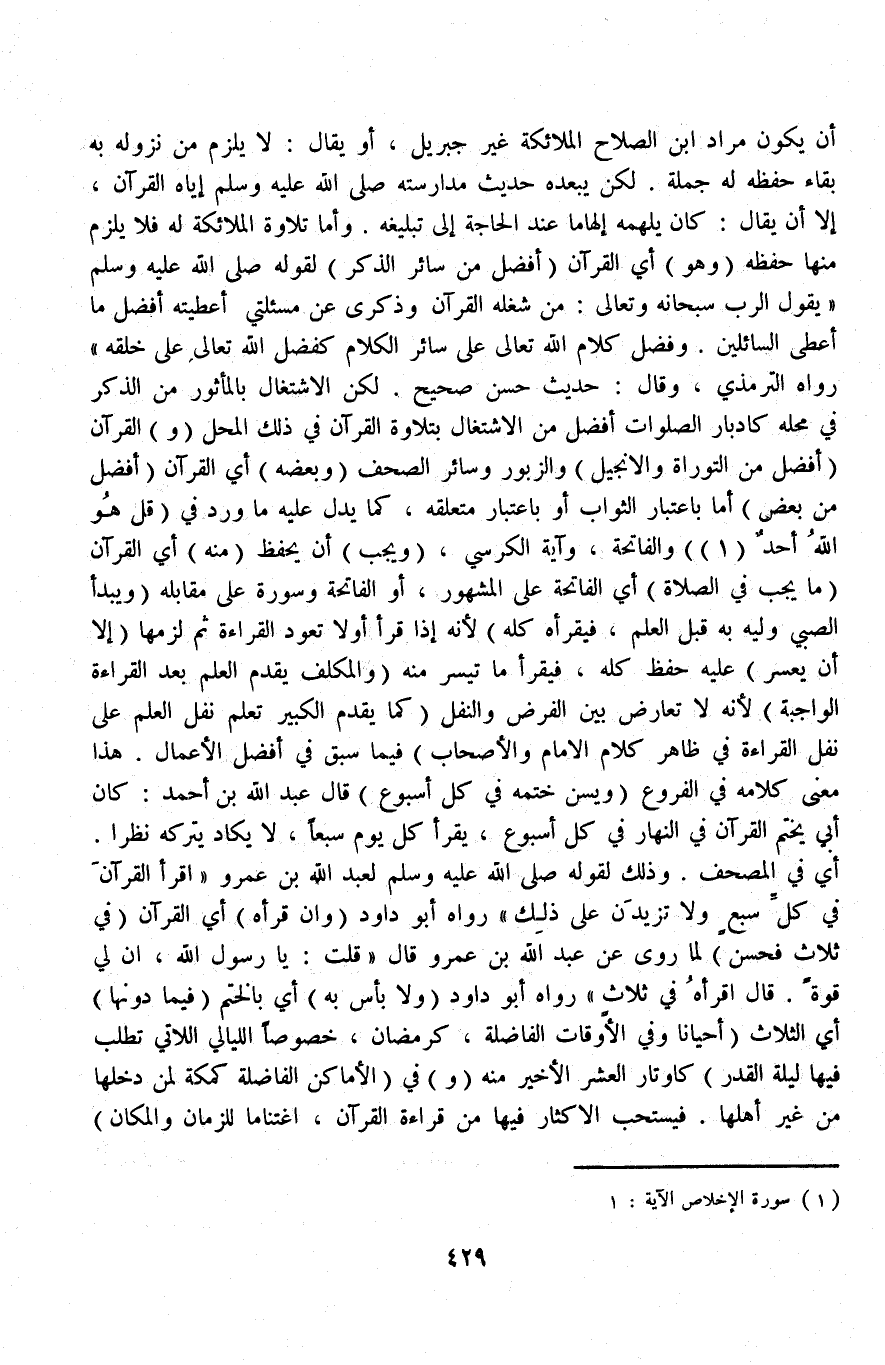 أَنْ يَكُونَ مُرَادُ ابْنِ الصَّلَاحِ الْمَلَائِكَةَ غَيْرَ جِبْرِيلَ أَوْ يُقَالُ: لَا يَلْزَمُ مِنْ نُزُولِهِ بِهِ بَقَاءُ حِفْظِهِ لَهُ جُمْلَةً لَكِنْ يُبْعِدُهُ حَدِيثُ مُدَارَسَتِهِ - صَلَّى اللَّهُ عَلَيْهِ وَسَلَّمَ - إيَّاهُ الْقُرْآنَ، إلَّا أَنْ يُقَالَ: كَانَ يُلْهِمُهُ إلْهَامًا عِنْدَ الْحَاجَةِ إلَى تَبْلِيغِهِ وَأَمَّا تِلَاوَةُ الْمَلَائِكَةِ لَهُ فَلَا يَلْزَمُ مِنْهَا حِفْظُهُ (وَهُوَ) أَيْ الْقُرْآنُ (أَفْضَلُ مِنْ سَائِرِ الذِّكْرِ) لِقَوْلِهِ - صَلَّى اللَّهُ عَلَيْهِ وَسَلَّمَ - «يَقُولُ الرَّبُّ سُبْحَانَهُ وَتَعَالَى: مَنْ شَغَلَهُ الْقُرْآنُ وَذِكْرِي عَنْ مَسْأَلَتِي أَعْطَيْتُهُ أَفْضَلَ مَا أُعْطِي السَّائِلِينَ وَفَضْلُ كَلَامِ اللَّهِ تَعَالَى عَلَى سَائِرِ الْكَلَامِ كَفَضْلِ اللَّهِ تَعَالَى عَلَى خَلْقِهِ» رَوَاهُ التِّرْمِذِيُّ، وَقَالَ حَدِيثٌ حَسَنٌ صَحِيحٌ.