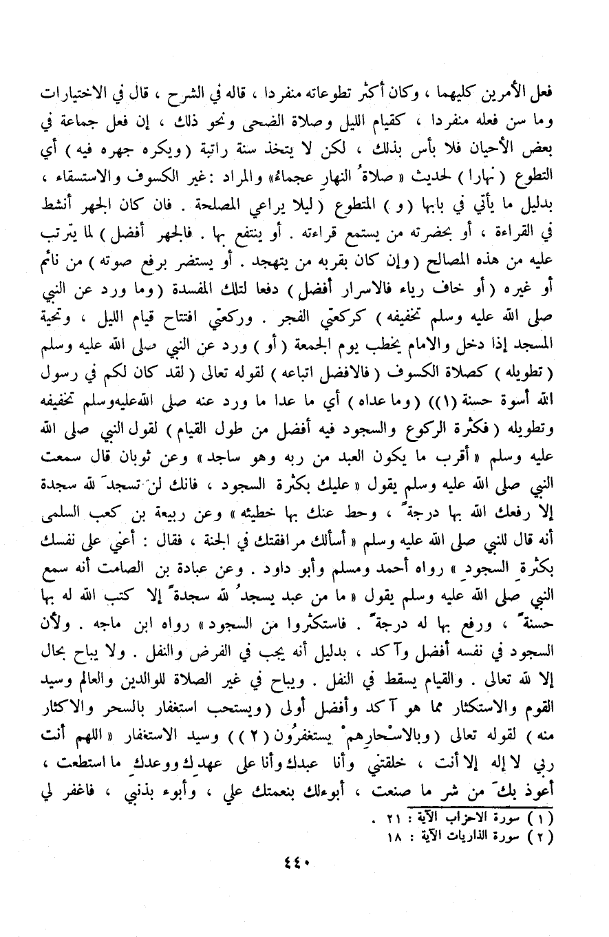 (وَمَا وَرَدَ عَنْ النَّبِيِّ - صَلَّى اللَّهُ عَلَيْهِ وَسَلَّمَ - تَخْفِيفُهُ) كَرَكْعَتَيْ الْفَجْرِ وَرَكْعَتَيْ افْتِتَاحِ قِيَامِ اللَّيْلِ، وَتَحِيَّةِ الْمَسْجِدِ إذَا دَخَلَ وَالْإِمَامُ يَخْطُبُ يَوْمَ الْجُمُعَةِ (أَوْ) وَرَدَ عَنْ النَّبِيِّ - صَلَّى اللَّهُ عَلَيْهِ وَسَلَّمَ - (تَطْوِيلُهُ) كَصَلَاةِ الْكُسُوفِ (فَالْأَفْضَلُ اتِّبَاعُهُ) لِقَوْلِهِ تَعَالَى {لَقَدْ كَانَ لَكُمْ فِي رَسُولِ اللَّهِ أُسْوَةٌ حَسَنَةٌ} [الأحزاب: ٢١] (وَمَا عَدَاهُ) أَيْ مَا عَدَا مَا وَرَدَ عَنْهُ - صَلَّى اللَّهُ عَلَيْهِ وَسَلَّمَ - تَخْفِيفُهُ وَتَطْوِيلُهُ (فَكَثْرَةُ الرُّكُوعِ وَالسُّجُودِ فِيهِ أَفْضَلُ مِنْ طُولِ الْقِيَامِ) لِقَوْلِ النَّبِيِّ - صَلَّى اللَّهُ عَلَيْهِ وَسَلَّمَ - «أَقْرَبُ مَا يَكُونُ الْعَبْدُ مِنْ رَبِّهِ وَهُوَ سَاجِدٌ» .