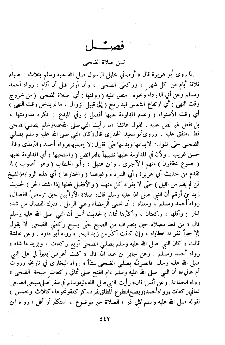 (فَصْلٌ تُسَنُّ صَلَاةُ الضُّحَى) لِمَا رَوَى أَبُو هُرَيْرَةَ قَالَ «أَوْصَانِي خَلِيلِي الرَّسُولُ - صَلَّى اللَّهُ عَلَيْهِ وَسَلَّمَ - بِثَلَاثٍ: صِيَامِ ثَلَاثَةِ أَيَّامٍ مِنْ كُلِّ شَهْرٍ وَرَكْعَتَيْ الضُّحَى، وَأَنْ أُوتِرَ قَبْلَ أَنْ أَنَامَ» رَوَاهُ أَحْمَدُ وَمُسْلِمٌ.