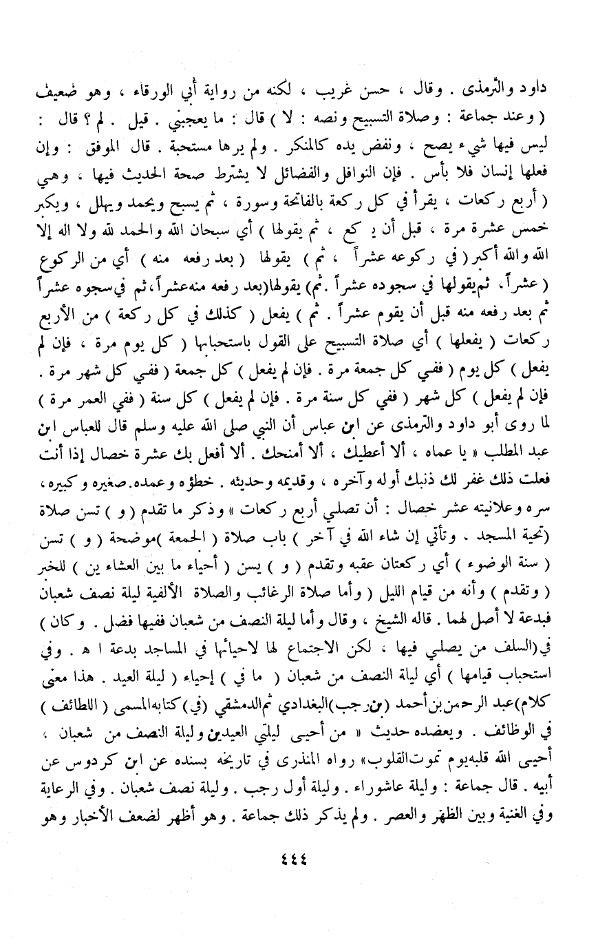 (وَعِنْدَ جَمَاعَةٍ وَصَلَاةُ التَّسْبِيحِ وَنَصُّهُ: لَا) قَالَ مَا يُعْجِبُنِي قِيلَ لِمَ؟ قَالَ لَيْسَ فِيهَا شَيْءٌ يَصِحُّ، وَنَفَضَ يَدَهُ كَالْمُنْكِرِ وَلَمْ يَرَهَا مُسْتَحَبَّةً قَالَ الْمُوَفَّقُ: وَإِنْ فَعَلَهَا إنْسَانٌ فَلَا بَأْسَ فَإِنَّ النَّوَافِلَ وَالْفَضَائِلَ لَا يُشْتَرَطُ صِحَّةُ الْحَدِيثِ فِيهَا، وَهِيَ (أَرْبَعُ رَكَعَاتٍ، يَقْرَأُ فِي كُلِّ رَكْعَةٍ بِالْفَاتِحَةِ وَسُورَةً، ثُمَّ يُسَبِّحُ وَيَحْمَدُ وَيُهَلِّلُ، وَيُكَبِّرُ خَمْسَ عَشْرَةَ مَرَّةً قَبْلَ أَنْ يَرْكَعَ، ثُمَّ يَقُولُهَا) أَيْ سُبْحَانَ اللَّهِ وَالْحَمْدُ لِلَّهِ وَلَا إلَهَ إلَّا اللَّهُ وَاَللَّهُ أَكْبَرُ (فِي رُكُوعِهِ عَشْرًا، ثُمَّ) يَقُولُهَا (بَعْدَ رَفْعِهِ مِنْهُ) أَيْ مِنْ الرُّكُوعِ (عَشْرًا، ثُمَّ يَقُولُهَا فِي سُجُودِهِ عَشْرًا ثُمَّ) يَقُولُهَا (بَعْدَ رَفْعِهِ مِنْهُ عَشْرًا، ثُمَّ فِي سُجُودِهِ عَشْرًا ثُمَّ بَعْدَ رَفْعِهِ مِنْهُ قَبْلَ أَنْ يَقُومَ عَشْرًا ثُمَّ) يَفْعَلُ (كَذَلِكَ فِي كُلِّ رَكْعَةٍ) مِنْ الْأَرْبَعِ رَكَعَاتٍ.
