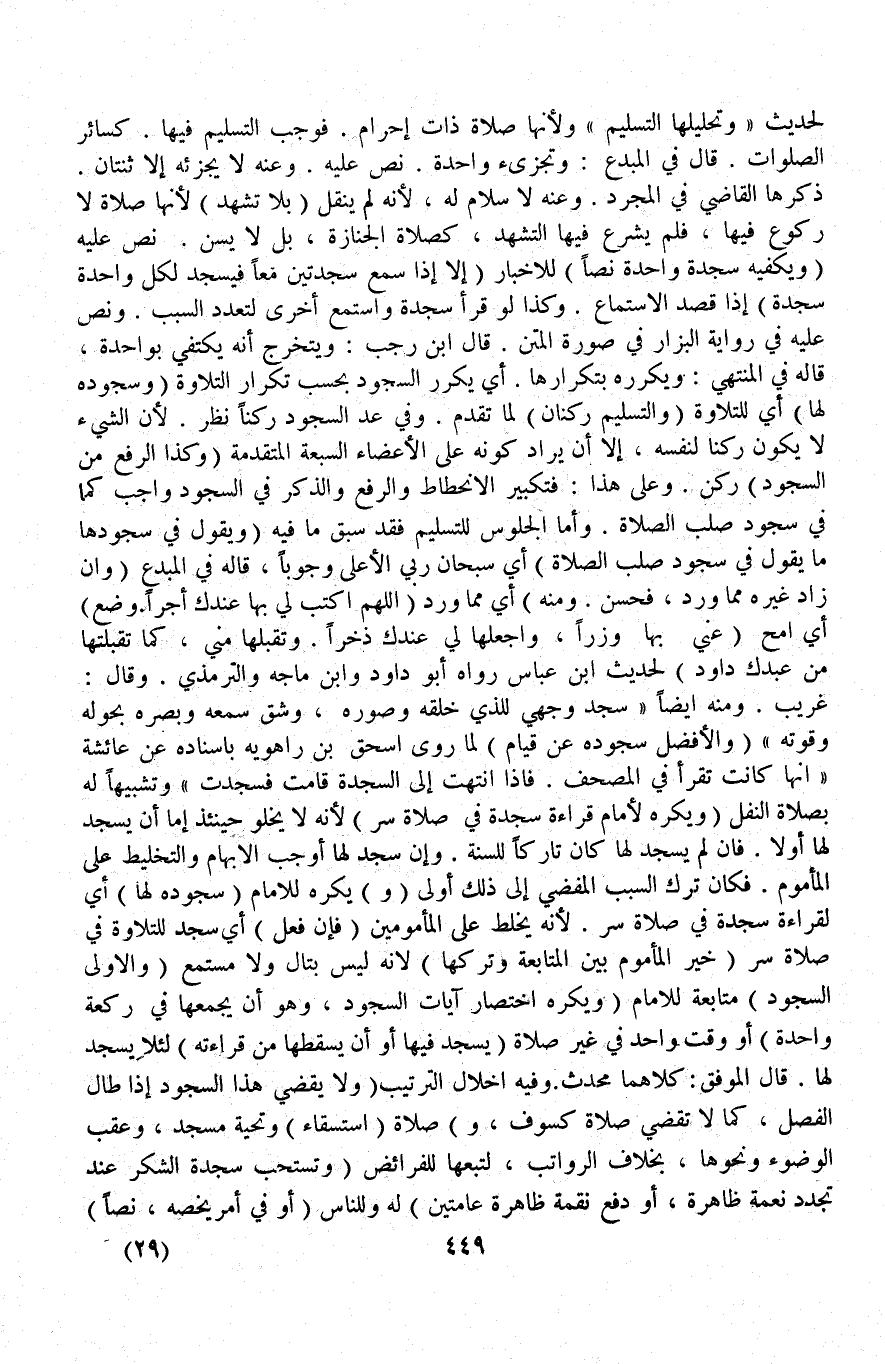 لِحَدِيثِ «وَتَحْلِيلُهَا التَّسْلِيمُ» وَلِأَنَّهَا صَلَاةٌ ذَاتُ إحْرَامٍ فَوَجَبَ التَّسْلِيمُ فِيهَا كَسَائِرِ الصَّلَوَاتِ قَالَ فِي الْمُبْدِعِ: وَتُجْزِئُ وَاحِدَةٌ نَصَّ عَلَيْهِ وَعَنْهُ لَا يُجْزِئُهُ إلَّا ثِنْتَانِ ذَكَرَهَا الْقَاضِي فِي الْمُجَرَّدِ وَعَنْهُ لَا سَلَامَ لَهُ،؛ لِأَنَّهُ لَمْ يُنْقَلْ (بِلَا تَشَهُّدٍ) ؛ لِأَنَّهَا صَلَاةٌ لَا رُكُوعَ فِيهَا، فَلَمْ يُشْرَعْ فِيهَا التَّشَهُّدُ، كَصَلَاةِ الْجِنَازَةِ، بَلْ لَا يُسَنُّ نَصَّ عَلَيْهِ (وَيَكْفِيهِ سَجْدَةٌ وَاحِدَةٌ نَصًّا) لِلْأَخْبَارِ (إلَّا إذَا سَمِعَ سَجْدَتَيْنِ مَعًا فَيَسْجُدُ لِكُلِّ وَاحِدَةٍ سَجْدَةً) إذَا قَصَدَ الِاسْتِمَاعَ.