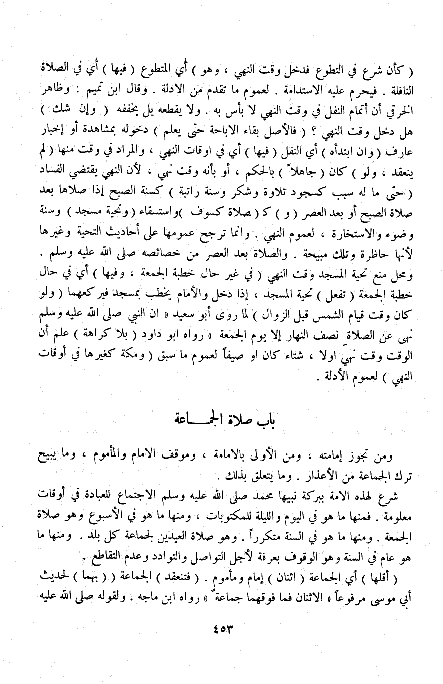 (بَابُ صَلَاةِ الْجَمَاعَةِ) وَمَنْ تَجُوزُ إمَامَتُهُ، وَمَنْ الْأَوْلَى بِالْإِمَامَةِ، وَمَوْقِفِ الْإِمَامِ وَالْمَأْمُومِ، وَمَا يُبِيحُ تَرْكَ الْجَمَاعَةِ مِنْ الْأَعْذَارِ وَمَا يَتَعَلَّقُ بِذَلِكَ شُرِعَ لِهَذِهِ الْأُمَّةِ بِبَرَكَةِ نَبِيِّهَا مُحَمَّدٍ - صَلَّى اللَّهُ عَلَيْهِ وَسَلَّمَ - الِاجْتِمَاعُ لِلْعِبَادَةِ فِي أَوْقَاتٍ مَعْلُومَةٍ فَمِنْهَا مَا هُوَ فِي الْيَوْمِ وَاللَّيْلَةِ لِلْمَكْتُوبَاتِ، وَمِنْهَا مَا هُوَ فِي الْأُسْبُوعِ وَهُوَ صَلَاةُ الْجُمُعَةِ وَمِنْهَا مَا هُوَ فِي السَّنَةِ مُتَكَرِّرًا وَهُوَ صَلَاةُ الْعِيدَيْنِ لِجَمَاعَةِ كُلِّ بَلَدٍ وَمِنْهَا مَا هُوَ عَامٌّ فِي السَّنَةِ وَهُوَ الْوُقُوفُ بِعَرَفَةَ لِأَجْلِ التَّوَاصُلِ وَالتَّوَادُدِ وَعَدَمِ التَّقَاطُعِ (أَقَلُّهَا) أَيْ الْجَمَاعَةِ (اثْنَانِ) إمَامٌ وَمَأْمُومٌ (فَتَنْعَقِدُ) الْجَمَاعَةُ (بِهِمَا) لِحَدِيثِ أَبِي مُوسَى مَرْفُوعًا «الِاثْنَانِ فَمَا فَوْقَهُمَا جَمَاعَةٌ» رَوَاهُ ابْنُ مَاجَهْ وَلِقَوْلِهِ - صَلَّى اللَّهُ عَلَيْهِ وَسَلَّمَ -