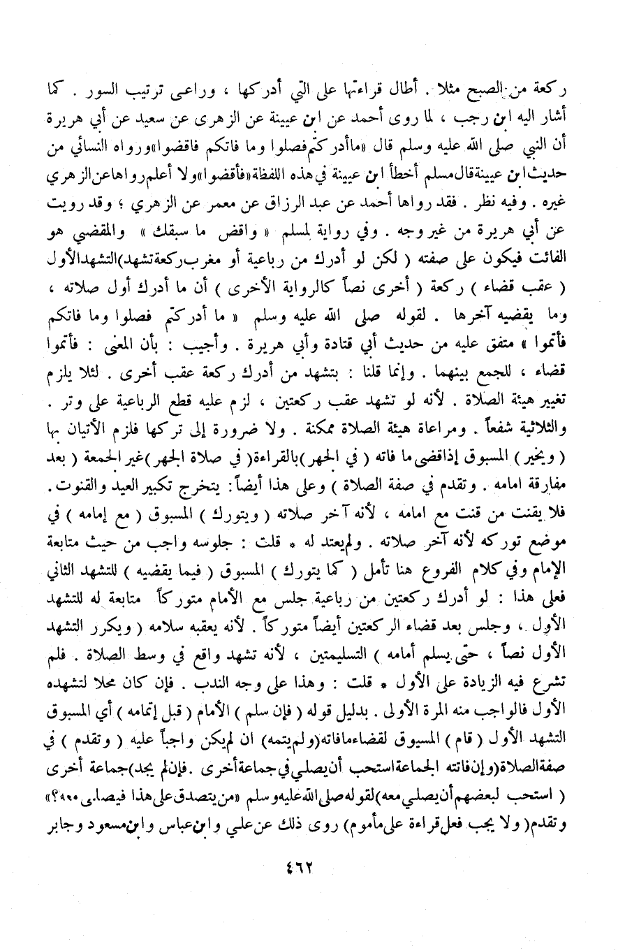رَكْعَةً مِنْ الصُّبْحِ مَثَلًا أَطَالَ قِرَاءَتَهَا أَيْ أَدْرَكَهَا، وَرَاعَى تَرْتِيبَ السُّوَرِ كَمَا أَشَارَ إلَيْهِ ابْنُ رَجَبٍ لِمَا رَوَى أَحْمَدُ عَنْ ابْنِ عُيَيْنَةَ عَنْ الزُّهْرِيِّ عَنْ سَعِيدٍ عَنْ أَبِي هُرَيْرَةَ أَنَّ النَّبِيَّ - صَلَّى اللَّهُ عَلَيْهِ وَسَلَّمَ - قَالَ «مَا أَدْرَكْتُمْ فَصَلُّوا وَمَا فَاتَكُمْ فَاقْضُوا» وَرَوَاهُ النَّسَائِيُّ مِنْ حَدِيثِ ابْنِ عُيَيْنَةَ قَالَ مُسْلِمٌ أَخْطَأَ ابْنُ عُيَيْنَةَ فِي هَذِهِ اللَّفْظَةِ فَاقْضُوا وَلَا أَعْلَمُ رَوَاهَا عَنْ الزُّهْرِيِّ غَيْرُهُ وَفِيهِ نَظَرٌ فَقَدْ رَوَاهَا أَحْمَدُ عَنْ عَبْدِ الرَّزَّاقِ عَنْ مَعْمَرٍ عَنْ الزُّهْرِيِّ وَقَدْ رُوِيَتْ عَنْ أَبِي هُرَيْرَةَ مِنْ غَيْرِ وَجْهٍ وَفِي رِوَايَةٍ لِمُسْلِمٍ «وَاقْضِ مَا سَبَقَك» وَالْمَقْضِيُّ هُوَ الْفَائِتُ فَيَكُونُ عَلَى صِفَتِهِ.