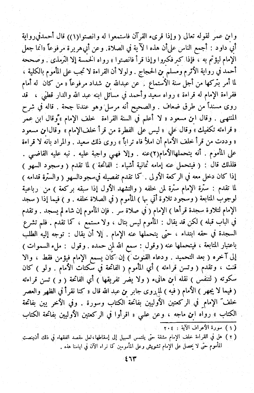 وَابْنِ عُمَرَ لِقَوْلِهِ تَعَالَى {وَإِذَا قُرِئَ الْقُرْآنُ فَاسْتَمِعُوا لَهُ وَأَنْصِتُوا} [الأعراف: ٢٠٤] قَالَ أَحْمَدُ فِي رِوَايَةِ أَبِي دَاوُد أَجْمَعَ النَّاسُ عَلَى أَنَّ هَذِهِ الْآيَةَ فِي الصَّلَاةِ.