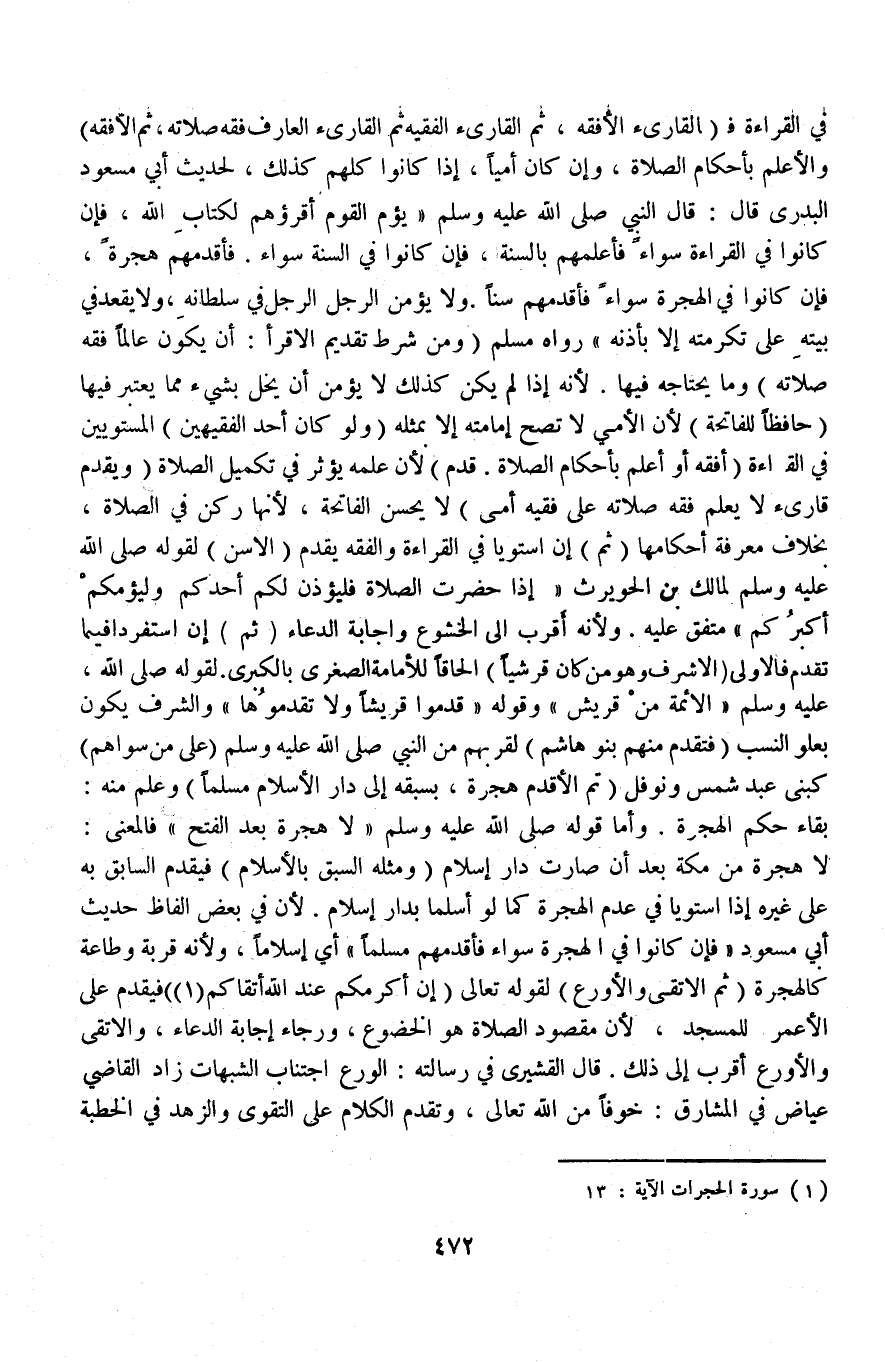 فِي الْقِرَاءَةِ (فَالْقَارِئُ الْأَفْقَهُ، ثُمَّ الْقَارِئُ الْفَقِيهُ ثُمَّ الْقَارِئُ الْعَارِفُ فِقْهَ صَلَاتِهِ، ثُمَّ الْأَفْقَهُ) وَالْأَعْلَمُ بِأَحْكَامِ الصَّلَاةِ، وَإِنْ كَانَ أُمِّيًّا، إذَا كَانُوا كُلُّهُمْ كَذَلِكَ، لِحَدِيثِ أَبِي مَسْعُودٍ الْبَدْرِيِّ قَالَ قَالَ النَّبِيُّ - صَلَّى اللَّهُ عَلَيْهِ وَسَلَّمَ - «يَؤُمُّ الْقَوْمَ أَقْرَؤُهُمْ لِكِتَابِ اللَّهِ فَإِنْ كَانُوا فِي الْقِرَاءَةِ سَوَاءٌ فَأَعْلَمُهُمْ بِالسُّنَّةِ، فَإِنْ كَانُوا فِي السُّنَّةِ سَوَاءٌ فَأَقْدَمُهُمْ هِجْرَةً فَإِنْ كَانُوا فِي الْهِجْرَةِ سَوَاءٌ فَأَقْدَمُهُمْ سِنًّا وَلَا يَؤُمَّنَّ الرَّجُلُ الرَّجُلَ فِي سُلْطَانِهِ، وَلَا يَقْعُدُ فِي بَيْتِهِ عَلَى تَكْرِمَتِهِ إلَّا بِإِذْنِهِ» رَوَاهُ مُسْلِمٌ.