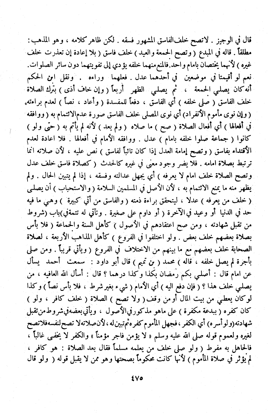 قَالَ فِي الْوَجِيزِ لَا تَصِحُّ خَلْفَ الْفَاسِقِ الْمَشْهُورِ فِسْقُهُ لَكِنَّ ظَاهَرَ كَلَامِهِ، وَهُوَ الْمَذْهَبُ مُطْلَقًا قَالَهُ فِي الْمُبْدِعُ.