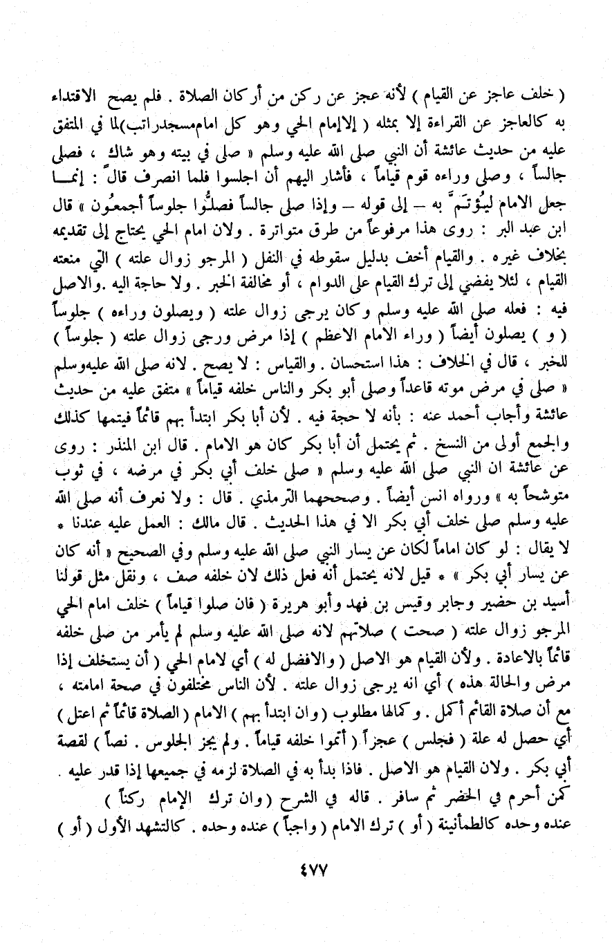 قَالَ فِي الْخِلَافِ: هَذَا اسْتِحْسَانٌ وَالْقِيَاسُ لَا يَصِحُّ؛ لِأَنَّهُ - صَلَّى اللَّهُ عَلَيْهِ وَسَلَّمَ - «صَلَّى فِي مَرَضِ مَوْتِهِ قَاعِدًا وَصَلَّى أَبُو بَكْرٍ وَالنَّاسُ خَلْفَهُ قِيَامًا» مُتَّفَقٌ عَلَيْهِ مِنْ حَدِيثِ عَائِشَةَ وَأَجَابَ أَحْمَدُ عَنْهُ بِأَنَّهُ لَا حُجَّةَ فِيهِ؛ لِأَنَّ أَبَا بَكْرٍ ابْتَدَأَ بِهِمْ قَائِمًا فَيُتِمُّهَا كَذَلِكَ وَالْجَمْعُ أَوْلَى مِنْ النَّسْخِ ثُمَّ يُحْتَمَلُ أَنَّ أَبَا بَكْرٍ كَانَ هُوَ الْإِمَامُ قَالَ ابْنُ الْمُنْذِرِ رُوِيَ عَنْ عَائِشَةَ «أَنَّ النَّبِيَّ - صَلَّى اللَّهُ عَلَيْهِ وَسَلَّمَ - صَلَّى خَلْفَ أَبِي بَكْرٍ فِي مَرَضِهِ، فِي ثَوْبٍ مُتَوَشِّحًا بِهِ» وَرَوَاهُ أَنَسٌ أَيْضًا وَصَحَّحَهُمَا التِّرْمِذِيُّ قَالَ وَلَا نَعْرِفُ أَنَّهُ - صَلَّى اللَّهُ عَلَيْهِ وَسَلَّمَ - صَلَّى خَلْفَ أَبِي بَكْرٍ إلَّا فِي هَذَا الْحَدِيثِ.
