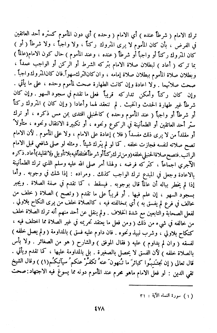 تَرَكَ الْإِمَامُ (شَرْطًا عِنْدَهُ) أَيْ الْإِمَامِ (وَحْدَهُ) أَيْ دُونَ الْمَأْمُومِ كَسَتْرِهِ أَحَدَ الْعَاتِقَيْنِ فِي الْفَرْضِ، بِأَنْ كَانَ الْمَأْمُومُ لَا يَرَى الْمَتْرُوكَ رُكْنًا، وَلَا وَاجِبًا، وَلَا شَرْطًا (أَوْ) كَانَ الْمَتْرُوكُ رُكْنًا أَوْ وَاجِبًا أَوْ شَرْطًا (عِنْدَهُ، وَعِنْدَ الْمَأْمُومِ) حَالَ كَوْنِ الْإِمَامِ (عَالِمًا) بِمَا تَرَكَهُ (أَعَادَ) لِبُطْلَانِ صَلَاةِ الْإِمَامِ بِتَرْكِهِ الشَّرْطَ أَوْ الرُّكْنَ أَوْ الْوَاجِبَ عَمْدًا، وَبُطْلَانُ صَلَاةِ الْمَأْمُومِ بِبُطْلَانِ صَلَاةِ إمَامِهِ، وَإِنْ كَانَ التَّرْكُ سَهْوًا فَإِنْ كَانَ الْمَتْرُوكُ وَاجِبًا صَحَّتْ صَلَاتُهُمَا وَلَا إعَادَةَ وَإِنْ كَانَتْ الطَّهَارَةُ صَحَّتْ لِمَأْمُومٍ وَحْدَهُ، عَلَى مَا يَأْتِي وَإِنْ كَانَ رُكْنًا وَأَمْكَنَ تَدَارُكُهُ قَرِيبًا فَعَلَى مَا تَقَدَّمَ فِي سُجُودِ السَّهْوِ وَإِنْ كَانَ شَرْطًا غَيْرَ طَهَارَةِ الْحَدَثِ وَالْخَبَثِ لَمْ تَنْعَقِدْ لَهُمَا وَأَعَادَا (وَإِنْ كَانَ) الْمَتْرُوكُ رُكْنًا أَوْ شَرْطًا أَوْ وَاجِبًا (عِنْدَ الْمَأْمُومِ وَحْدَهُ) كَالْحَنْبَلِيِّ اقْتَدَى بِمَنْ مَسَّ ذَكَرَهُ، أَوْ تَرْكَ سَتْرَ أَحَدِ الْعَاتِقَيْنِ أَوْ الطُّمَأْنِينَةَ فِي الرُّكُوعِ وَنَحْوِهِ، أَوْ تَكْبِيرَةَ الِانْتِقَالِ وَنَحْوِهِ، مُتَأَوِّلًا أَوْ مُقَلِّدًا مَنْ لَا يَرَى ذَلِكَ مُفْسِدًا (فَلَا) إعَادَةَ عَلَى الْإِمَامِ، وَلَا عَلَى الْمَأْمُومِ؛ لِأَنَّ الْإِمَامَ تَصِحُّ صَلَاتُهُ لِنَفْسِهِ فَجَازَتْ خَلْفَهُ كَمَا لَوْ لَمْ يَتْرُكْ شَيْئًا وَمِثْلُهُ لَوْ صَلَّى شَافِعِيٌّ قَبْلَ الْإِمَامِ الرَّاتِبِ فَتَصِحُّ صَلَاةُ الْحَنْبَلِيِّ خَلْفَهُ.