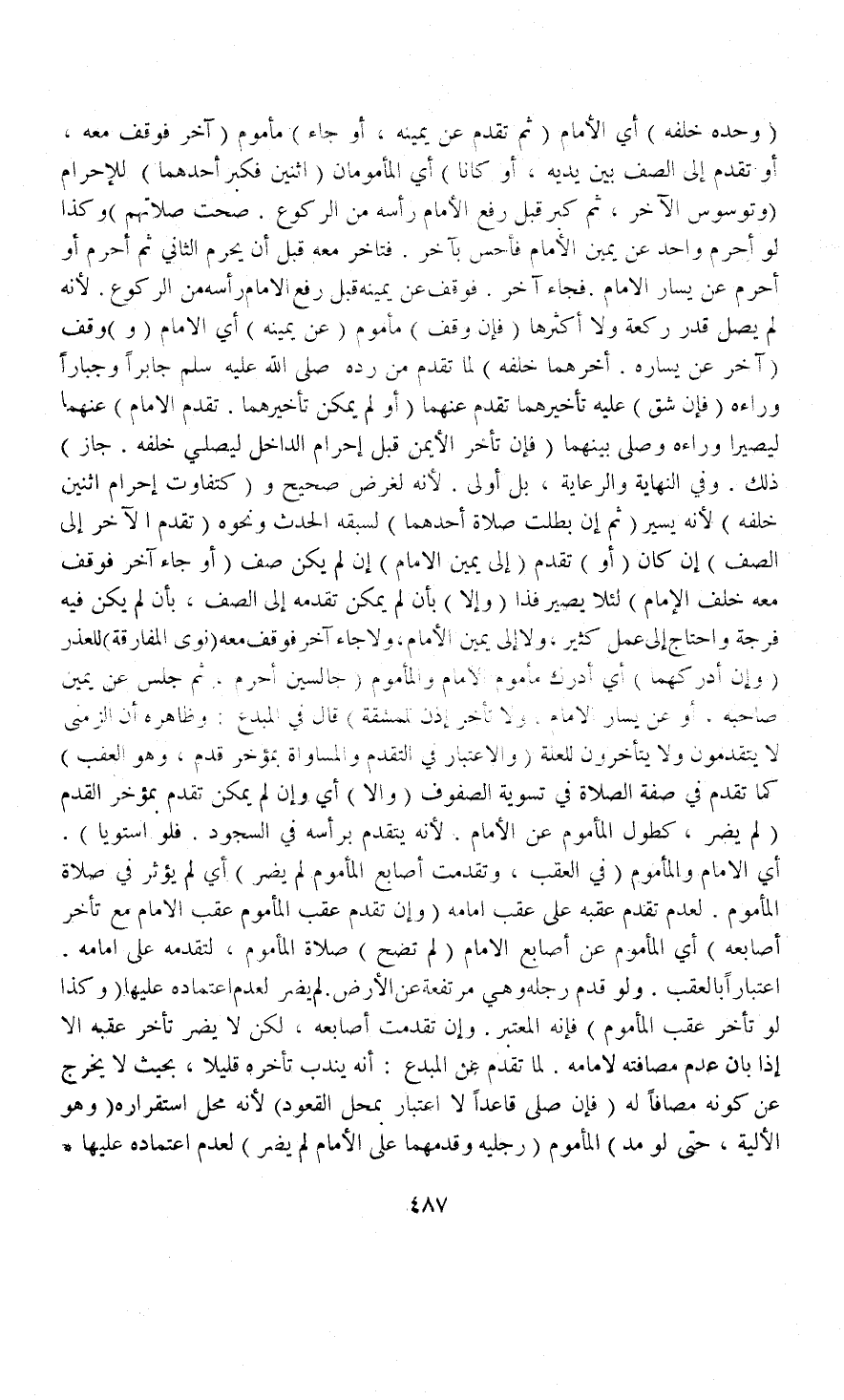 (وَالِاعْتِبَارُ فِي التَّقَدُّمِ وَالْمُسَاوَاةِ بِمُؤَخَّرِ قَدَمٍ، وَهُوَ الْعَقِبُ) كَمَا تَقَدَّمَ فِي صِفَةِ الصَّلَاةِ فِي تَسْوِيَةِ الصُّفُوفِ (وَإِلَّا) أَيْ وَإِنْ لَمْ يُمْكِنْ تَقَدُّمٌ بِمُؤَخَّرِ الْقَدَمِ (لَمْ يَضُرَّ، كَطُولِ الْمَأْمُومِ عَنْ الْإِمَامِ؛ لِأَنَّهُ يَتَقَدَّمُ بِرَأْسِهِ فِي السُّجُودِ فَلَوْ اسْتَوَيَا) أَيْ الْإِمَامُ وَالْمَأْمُومُ (فِي الْعَقِبِ، وَتَقَدَّمَتْ أَصَابِعُ الْمَأْمُومِ لَمْ يَضُرَّ) أَيْ لَمْ يُؤَثِّرْ فِي صَلَاةِ الْمَأْمُومِ لِعَدَمِ تَقَدُّمِ عَقِبِهِ عَلَى عَقِبِ إمَامِهِ.
