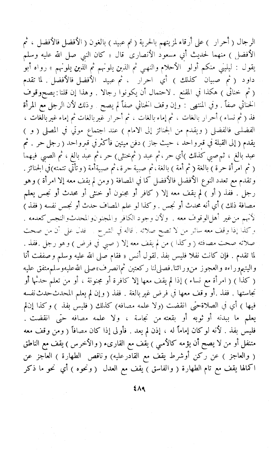 الرِّجَالِ (أَحْرَارٌ) عَلَى أَرِقَّاءَ لِمَزِيَّتِهِمْ بِالْحُرِّيَّةِ (ثُمَّ عَبِيدٌ) بَالِغُونَ (الْأَفْضَلُ فَالْأَفْضَلُ، ثُمَّ الْأَفْضَلُ) مِنْهُمَا لِحَدِيثِ أَبِي مَسْعُودٍ الْأَنْصَارِيِّ قَالَ كَانَ النَّبِيُّ - صَلَّى اللَّهُ عَلَيْهِ وَسَلَّمَ - يَقُولُ: «لِيَلِيَنِي مِنْكُمْ أُولُو الْأَحْلَامِ وَالنُّهَى ثُمَّ الَّذِينَ يَلُونَهُمْ ثُمَّ الَّذِينَ يَلُونَهُمْ» رَوَاهُ أَبُو دَاوُد (ثُمَّ صِبْيَانٌ كَذَلِكَ) أَيْ أَحْرَارٌ، ثُمَّ عَبِيدٌ الْأَفْضَلُ فَالْأَفْضَلُ لِمَا تَقَدَّمَ (ثُمَّ خَنَاثَى) هَكَذَا فِي الْمُقْنِعُ لِاحْتِمَالِ أَنْ يَكُونُوا رِجَالًا وَهَذَا إنْ قُلْنَا: يَصِحُّ وُقُوفُ الْخَنَاثَى صَفًّا.