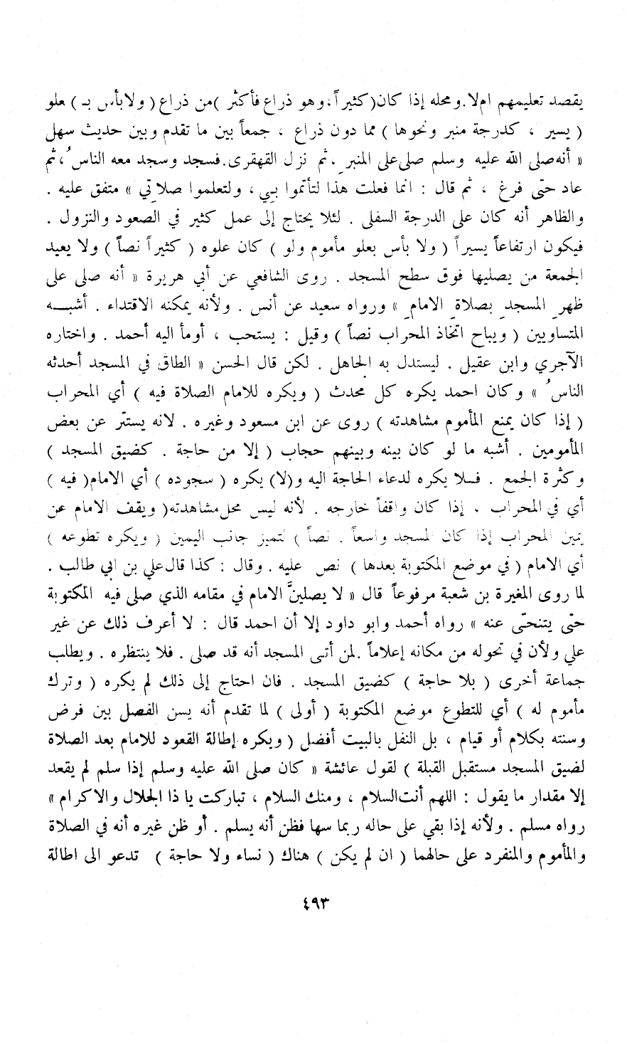 (وَيُكْرَهُ لِلْإِمَامِ الصَّلَاةُ فِيهِ) أَيْ الْمِحْرَابِ (إذَا كَانَ يَمْنَعُ الْمَأْمُومَ مُشَاهَدَتَهُ) رُوِيَ عَنْ ابْنِ مَسْعُودٍ وَغَيْرِهِ؛ لِأَنَّهُ يَسْتَتِرُ عَنْ بَعْضِ الْمَأْمُومِينَ أَشْبَهَ مَا لَوْ كَانَ بَيْنَهُ وَبَيْنَهُمْ حِجَابٌ (إلَّا مِنْ حَاجَةٍ كَضِيقِ الْمَسْجِدِ) وَكَثْرَةِ الْجَمْعِ فَلَا يُكْرَهُ لِدُعَاءِ الْحَاجَةِ إلَيْهِ.