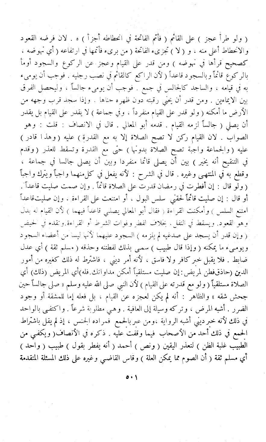 (وَإِذَا قَالَ طَبِيبٌ) سُمِّيَ بِذَلِكَ لِفِطْنَتِهِ وَحِذْقِهِ (مُسْلِمٌ ثِقَةٌ) أَيْ عَدْلٌ ضَابِطٌ فَلَا يُقْبَلُ خَبَرُ كَافِرٍ وَلَا فَاسِقٍ،؛ لِأَنَّهُ أَمْرٌ دِينِيٌّ، فَاشْتُرِطَ لَهُ ذَلِكَ كَغَيْرِهِ مِنْ أُمُورِ الدِّينِ (حَاذِقٌ فَطِنٌ لِمَرِيضٍ: إنْ صَلَّيْتَ مُسْتَلْقِيًا أَمْكَنَ مُدَاوَاتُكَ فَلَهُ) أَيْ الْمَرِيضِ (ذَلِكَ) أَيْ الصَّلَاةُ مُسْتَلْقِيًا (وَلَوْ مَعَ قُدْرَتِهِ عَلَى الْقِيَامِ) ؛ لِأَنَّ النَّبِيَّ - صَلَّى اللَّهُ عَلَيْهِ وَسَلَّمَ - صَلَّى جَالِسًا حِينَ جُحِشَ شِقُّهُ وَالظَّاهِرُ: أَنَّهُ لَمْ يَكُنْ لِعَجْزِهِ عَنْ الْقِيَامِ، بَلْ فَعَلَهُ إمَّا لِلْمَشَقَّةِ أَوْ وُجُودِ الضَّرَرِ أَشْبَهَ الْمَرَضَ وَتَرْكُهُ وَسِيلَةٌ إلَى الْعَافِيَةِ وَهِيَ مَطْلُوبَةٌ شَرْعًا وَاكْتُفِيَ بِالْوَاحِدِ فِي ذَلِكَ؛ لِأَنَّهُ خَبَرٌ دِينِيٌّ أَشْبَهَ الرِّوَايَةَ وَمَنْ عَبَّرَ بِالْجَمْعِ فَمُرَادُهُ الْجِنْسُ، إذْ لَمْ يَقُلْ بِاشْتِرَاطِ الْجَمْعِ فِي ذَلِكَ أَحَدٌ مِنْ الْأَصْحَابِ فِيمَا وَقَفْتُ عَلَيْهِ ذَكَرَهُ فِي الْإِنْصَافِ.