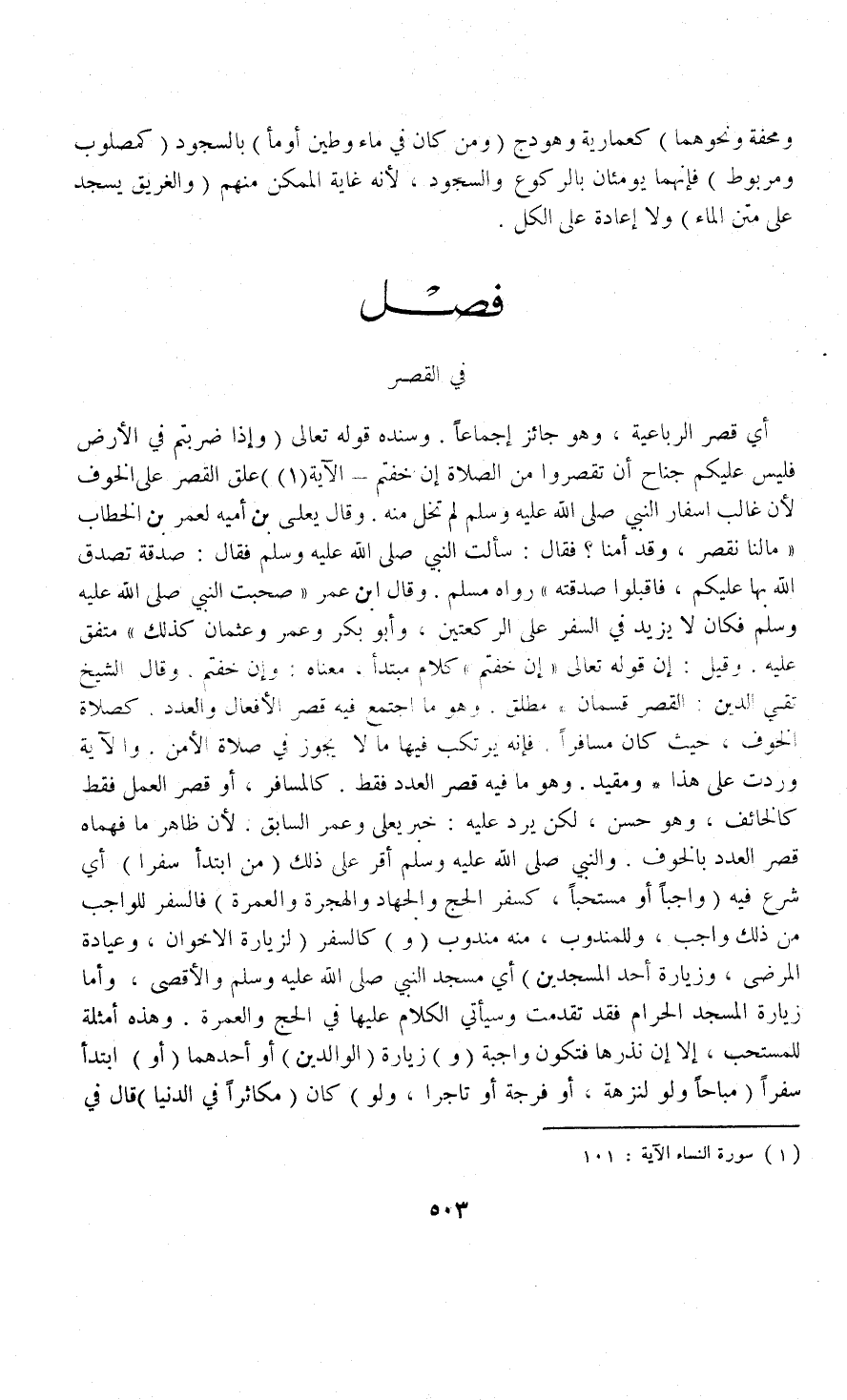 «وَقَالَ ابْنُ عُمَرَ صَحِبْتُ النَّبِيَّ - صَلَّى اللَّهُ عَلَيْهِ وَسَلَّمَ - فَكَانَ لَا يَزِيدُ فِي السَّفَرِ عَلَى الرَّكْعَتَيْنِ، وَأَبُو بَكْرٍ وَعُمَرُ وَعُثْمَانُ كَذَلِكَ» مُتَّفَقٌ عَلَيْهِ وَقِيلَ: إنَّ قَوْله تَعَالَى {إِنْ خِفْتُمْ} [النساء: ١٠١] كَلَامٌ مُبْتَدَأٌ، مَعْنَاهُ: وَإِنْ خِفْتُمْ وَقَالَ الشَّيْخُ تَقِيُّ الدِّينِ: الْقَصْرُ قِسْمَانِ مُطْلَقٌ وَهُوَ مَا اجْتَمَعَ فِيهِ قَصْرُ الْأَفْعَالِ وَالْعَدَدِ كَصَلَاةِ الْخَوْفِ، حَيْثُ كَانَ مُسَافِرًا فَإِنَّهُ يُرْتَكَبُ فِيهَا مَا لَا يَجُوزُ فِي صَلَاةِ الْأَمْنِ وَالْآيَةُ وَرَدَتْ عَلَى هَذَا وَمُقَيَّدٌ وَهُوَ مَا فِيهِ قَصْرُ الْعَدَدِ فَقَطْ كَالْمُسَافِرِ، أَوْ قَصْرُ الْعَمَلِ، فَقَطْ كَالْخَائِفِ، وَهُوَ حَسَنٌ لَكِنْ يَرُدُّ عَلَيْهِ: خَبَرُ يَعْلَى وَعُمَرَ السَّابِقُ؛ لِأَنَّ ظَاهَرَ مَا فَهِمَاهُ قَصْرُ الْعَدَدِ بِالْخَوْفِ وَالنَّبِيُّ - صَلَّى اللَّهُ عَلَيْهِ وَسَلَّمَ - أَقَرَّ عَلَى ذَلِكَ.
