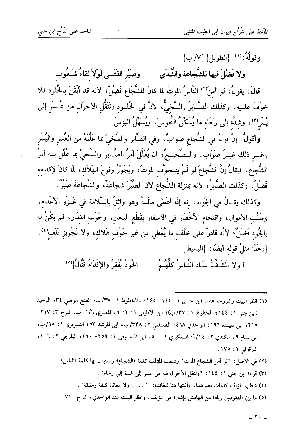 ولا فَضْلَ فيها للشَّجاعة والنَّدَى ... وصَبْرِ الفَتَى لَوْلاَ لِقاءُ شَعُوبِ