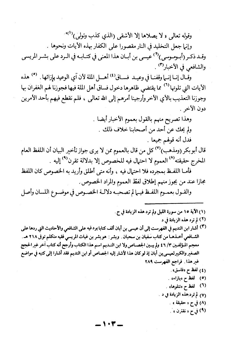 وَقَدْ ذَكَرَ (أَبُو مُوسَى) عِيسَى بْنُ أَبَانَ هَذَا الْمَعْنَى فِي كِتَابِهِ فِي الرَّدِّ عَلَى بِشْرٍ الْمَرِيسِيِّ وَالشَّافِعِيُّ فِي الْأَخْبَارِ. وَقَالَ إنَّا إنَّمَا وَقَفْنَا فِي وَعِيدِ فُسَّاقِ أَهْلِ الْمِلَّةِ لِأَنَّ آيَ الْوَعِيدِ بِإِزَائِهَا. هَذِهِ الْآيَاتُ الَّتِي تَلَوْتهَا مِمَّا يَقْتَضِي ظَاهِرُهَا دُخُولَ فُسَّاقِ أَهْلِ الْمِلَّةِ فِيهَا فَجَوَّزْنَا لَهُمْ الْغُفْرَانَ بِهَا وَجَوَّزْنَا التَّعْذِيبَ بِالْآيِ الْأُخَرِ وَأَرْجَيْنَا أَمْرَهُمْ إلَى اللَّهِ تَعَالَى، فَلَمْ نَقْطَعْ فِيهِمْ بِأَحَدِ الْأَمْرَيْنِ دُونَ الْآخَرِ. وَهَذَا تَصْرِيحٌ مِنْهُمْ بِالْقَوْلِ بِعُمُومِ الْأَخْبَارِ أَيْضًا. وَلَمْ يُحْكَ عَنْ أَحَدٍ مِنْ أَصْحَابِنَا خِلَافُ ذَلِكَ. فَدَلَّ أَنَّهُ قَوْلُهُمْ جَمِيعًا. .