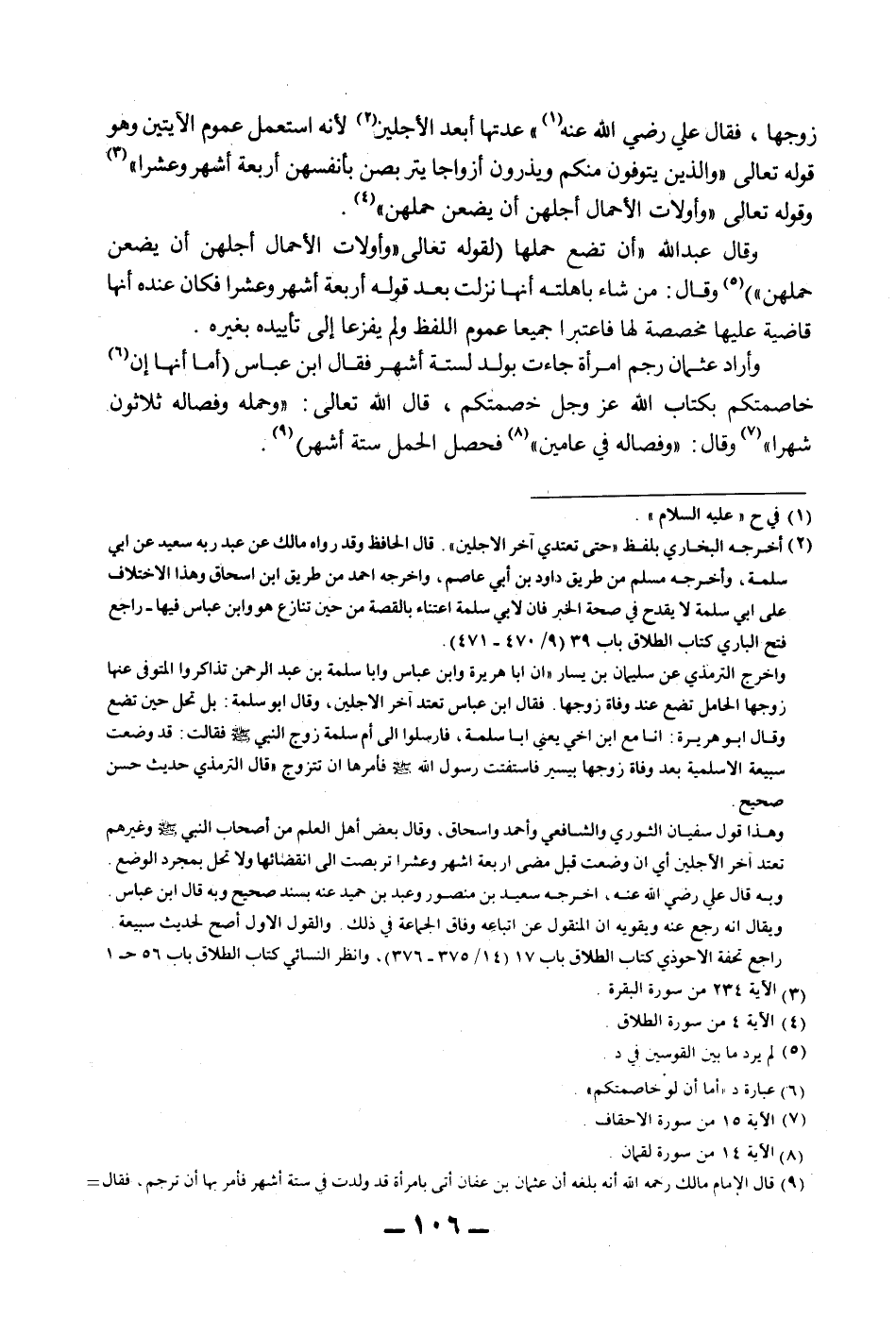 زَوْجُهَا، فَقَالَ عَلِيٌّ - رَضِيَ اللَّهُ عَنْهُ - " عِدَّتُهَا أَبْعَدُ الْأَجَلَيْنِ لِأَنَّهُ اسْتَعْمَلَ عُمُومَ الْآيَتَيْنِ وَهُوَ قَوْله تَعَالَى {وَاَلَّذِينَ يُتَوَفَّوْنَ مِنْكُمْ وَيَذَرُونَ أَزْوَاجًا يَتَرَبَّصْنَ بِأَنْفُسِهِنَّ أَرْبَعَةَ أَشْهُرٍ وَعَشْرًا} [البقرة: 234] وقَوْله تَعَالَى {وَأُولَاتُ الْأَحْمَالِ أَجَلُهُنَّ أَنْ يَضَعْنَ حَمْلَهُنَّ} [الطلاق: 4] . وَقَالَ عَبْدُ اللَّهِ " أَنْ تَضَعَ حَمْلَهَا (لِقَوْلِهِ تَعَالَى {وَأُولَاتُ الْأَحْمَالِ أَجَلُهُنَّ أَنْ يَضَعْنَ حَمْلَهُنَّ} [الطلاق: 4] وَقَالَ: مَنْ شَاءَ بَاهَلْته أَنَّهَا نَزَلَتْ بَعْدَ قَوْلِهِ {أَرْبَعَةَ أَشْهُرٍ وَعَشْرًا} [البقرة: 234] فَكَانَ عِنْدَهُ أَنَّهَا قَاضِيَةٌ عَلَيْهَا مُخَصِّصَةٌ لَهَا فَاعْتَبَرَا جَمِيعًا عُمُومَ اللَّفْظِ وَلَمْ يَفْزَعَا إلَى تَأْيِيدِهِ بِغَيْرِهِ. وَأَرَادَ عُثْمَانُ رَجْمَ امْرَأَةٍ جَاءَتْ بِوَلَدٍ لِسِتَّةِ أَشْهُرٍ فَقَالَ ابْنُ عَبَّاسٍ (أَمَا إنَّهَا إنْ خَاصَمَتْكُمْ بِكِتَابِ اللَّهِ عَزَّ وَجَلَّ خَصَمْتُكُمْ، قَالَ اللَّهُ تَعَالَى: {وَحَمْلُهُ وَفِصَالُهُ ثَلَاثُونَ شَهْرًا} [الأحقاف: 15] وَقَالَ: {وَفِصَالُهُ فِي عَامَيْنِ} [لقمان: 14] فَحَصَلَ الْحَمْلُ سِتَّةَ أَشْهُرٍ) .