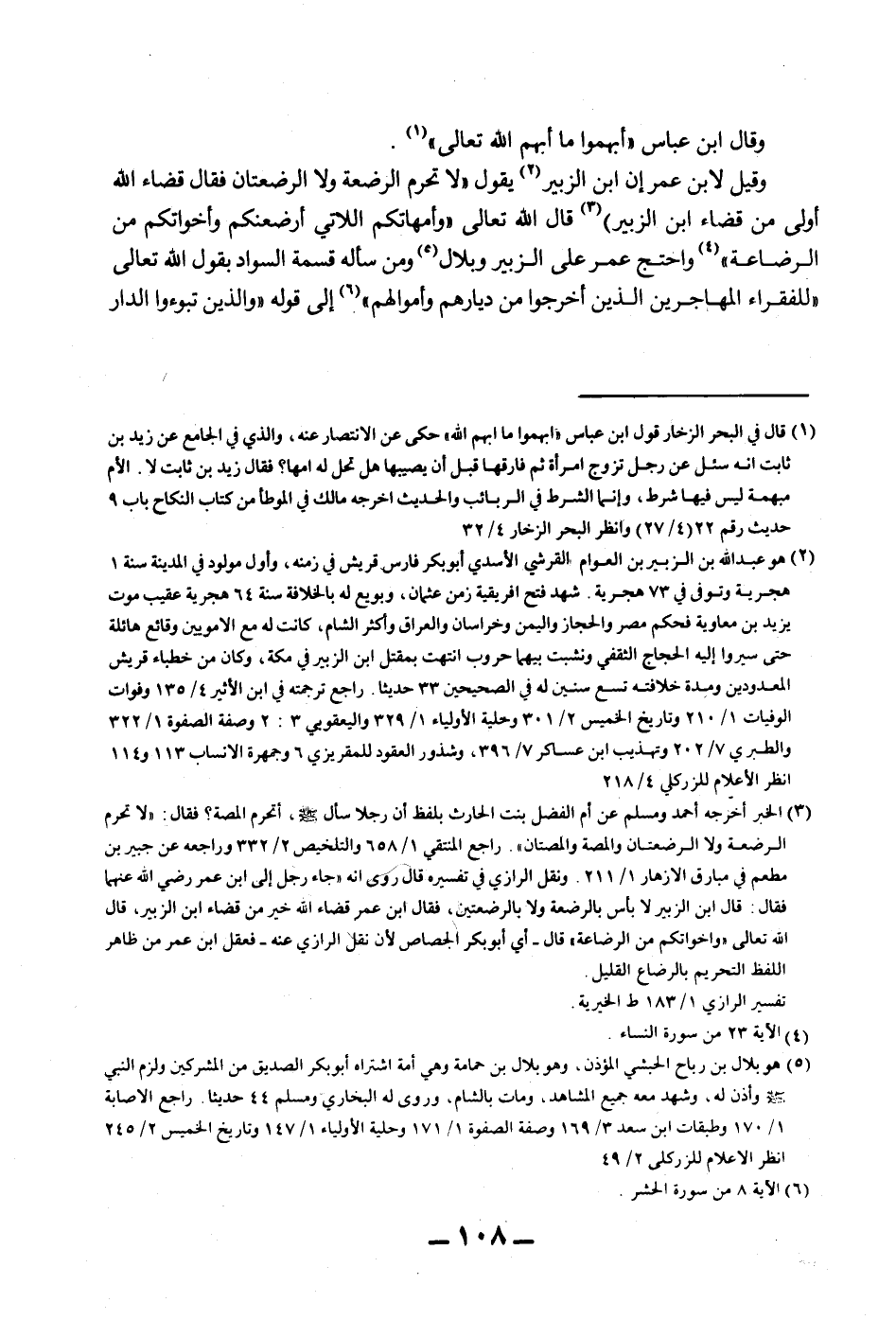 وَقَالَ ابْنُ عَبَّاسٍ " أَبْهِمُوا مَا أَبْهَمَ اللَّهُ تَعَالَى ". وَقِيلَ لِابْنِ عُمَرَ إنَّ ابْنَ الزُّبَيْرِ يَقُولُ " لَا تُحَرِّمُ الرَّضْعَةُ وَلَا الرَّضْعَتَانِ فَقَالَ قَضَاءُ اللَّهِ أَوْلَى مِنْ قَضَاءِ ابْنِ الزُّبَيْرِ) قَالَ اللَّهُ تَعَالَى {وَأُمَّهَاتُكُمْ اللَّاتِي أَرْضَعْنَكُمْ وَأَخَوَاتُكُمْ مِنْ الرَّضَاعَةِ} [النساء: 23] وَاحْتَجَّ عُمَرُ عَلَى الزُّبَيْرِ وَبِلَالٍ وَمَنْ سَأَلَهُ قِسْمَةَ السَّوَادِ بِقَوْلِ اللَّهِ تَعَالَى " {لِلْفُقَرَاءِ الْمُهَاجِرِينَ الَّذِينَ أُخْرِجُوا مِنْ دِيَارِهِمْ وَأَمْوَالِهِمْ} [الحشر: 8] إلَى قَوْلِهِ {وَاَلَّذِينَ تَبَوَّءُوا الدَّارَ