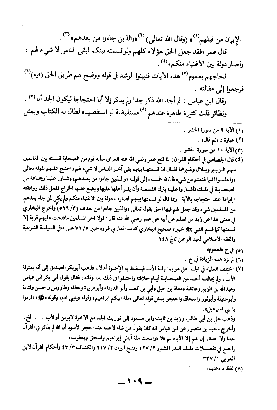وَالْإِيمَانَ مِنْ قَبْلِهِمْ} [الحشر: 9] (وَقَالَ اللَّهُ تَعَالَى) {وَاَلَّذِينَ جَاءُوا مِنْ بَعْدِهِمْ} [الحشر: 10] . قَالَ عُمَرُ " فَقَدْ جَعَلَ الْحَقَّ لِهَؤُلَاءِ كُلِّهِمْ وَلَوْ قَسَمْته بَيْنَكُمْ لَبَقِيَ النَّاسُ لَا شَيْءَ لَهُمْ، وَلَصَارَ دُولَةً بَيْنَ الْأَغْنِيَاءِ مِنْكُمْ ". فَحَاجَّهُمْ بِعُمُومِ هَذِهِ الْآيَاتِ فَتَبَيَّنُوا الرُّشْدَ فِي قَوْلِهِ، وَوَضَحَ لَهُمْ طَرِيقُ الْحَقِّ (فِيهِ) فَرَجَعُوا إلَى مَقَالَتِهِ.