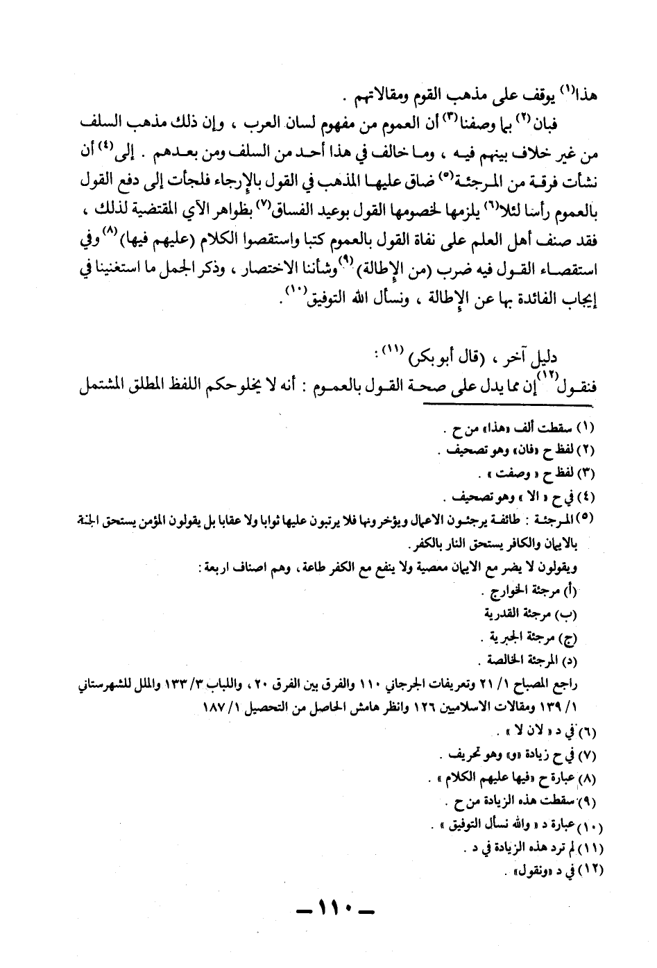 هَذَا يُوقَفُ عَلَى مَذْهَبِ الْقَوْمِ وَمَقَالَاتِهِمْ. فَبَانَ بِمَا وَصَفْنَا أَنَّ الْعُمُومَ مِنْ مَفْهُومِ لِسَانِ الْعَرَبِ، وَإِنَّ ذَلِكَ مَذْهَبُ السَّلَفِ مِنْ غَيْرِ خِلَافٍ بَيْنَهُمْ فِيهِ، وَمَا خَالَفَ فِي هَذَا أَحَدٌ مِنْ السَّلَفِ وَمَنْ بَعْدَهُمْ. إلَى أَنْ نَشَأَتْ فِرْقَةٌ مِنْ الْمُرْجِئَةِ ضَاقَ عَلَيْهَا الْمَذْهَبُ فِي الْقَوْلِ بِالْإِرْجَاءِ فَلَجَأَتْ إلَى دَفْعِ الْقَوْلِ بِالْعُمُومِ رَأْسًا لِئَلَّا يَلْزَمَهَا لِخُصُومِهَا الْقَوْلُ بِوَعِيدِ الْفُسَّاقِ بِظَوَاهِرِ الْآيِ الْمُقْتَضِيَةِ لِذَلِكَ، فَقَدْ صَنَّفَ أَهْلُ الْعِلْمِ عَلَى نُفَاةِ الْقَوْلِ بِالْعُمُومِ كُتُبًا وَاسْتَقْصَوْا الْكَلَامَ (عَلَيْهِمْ فِيهَا) وَفِي اسْتِقْصَاءِ الْقَوْلِ فِيهِ ضَرْبٌ (مِنْ الْإِطَالَةِ) وَشَأْنُنَا الِاخْتِصَارُ، وَذِكْرُ الْجُمَلِ مَا اسْتَغْنَيْنَا فِي إيجَابِ الْفَائِدَةِ بِهَا عَنْ الْإِطَالَةِ، وَنَسْأَلُ اللَّهَ التَّوْفِيقَ.