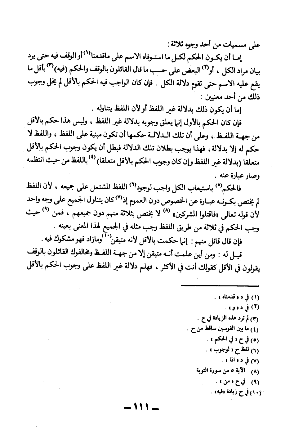 عَلَى مُسَمَّيَاتٍ مِنْ أَحَدِ وُجُوهٍ ثَلَاثَةٍ: إمَّا أَنْ يَكُونَ الْحُكْمُ لِكُلِّ مَا اسْتَوْفَاهُ الِاسْمُ عَلَى مَا قَدَّمْنَا أَوْ الْوَقْفُ فِيهِ حَتَّى يَرِدَ بَيَانُ مُرَادِ الْكُلِّ، أَوْ الْبَعْضِ عَلَى حَسَبِ مَا قَالَ الْقَائِلُونَ بِالْوَقْفِ وَالْحُكْمُ (فِيهِ) بِأَقَلِّ مَا يَقَعُ عَلَيْهِ الِاسْمُ حَتَّى تَقُومَ دَلَالَةُ الْكُلِّ. فَإِنْ كَانَ الْوَاجِبُ فِيهِ الْحُكْمَ بِالْأَقَلِّ لَمْ يَخْلُ وُجُوبُ ذَلِكَ مِنْ أَحَدِ مَعْنَيَيْنِ: إمَّا أَنْ يَكُونَ ذَلِكَ بِدَلَالَةِ غَيْرِ اللَّفْظِ أَوْ لِأَنَّ اللَّفْظَ يَتَنَاوَلُهُ. فَإِنْ كَانَ الْحُكْمُ بِالْأَوَّلِ إنَّمَا يُعَلَّقُ وُجُوبُهُ بِدَلَالَةِ غَيْرِ اللَّفْظِ، وَلَيْسَ هَذَا حُكْمٌ بِالْأَقَلِّ مِنْ جِهَةِ اللَّفْظِ، وَعَلَى أَنَّ تِلْكَ الدَّلَالَةَ حُكْمُهَا أَنْ تَكُونَ مَبْنِيَّةً عَلَى اللَّفْظِ، وَاللَّفْظُ لَا حُكْمَ لَهُ إلَّا بِدَلَالَةٍ، فَهَذَا يُوجِبُ بُطْلَانَ تِلْكَ الدَّلَالَةِ فَبَطَلَ أَنْ يَكُونَ وُجُوبُ الْحُكْمِ بِالْأَقَلِّ. مُتَعَلِّقًا (بِدَلَالَةِ غَيْرِ اللَّفْظِ وَإِنْ كَانَ وُجُوبُ الْحُكْمِ بِالْأَقَلِّ مُتَعَلِّقًا) بِاللَّفْظِ مِنْ حَيْثُ انْتَظَمَهُ وَصَارَ عِبَارَةً عَنْهُ. فَالْحُكْمُ بِاسْتِيعَابِ الْكُلِّ وَاجِبٌ لِوُجُودِ اللَّفْظِ الْمُشْتَمِلِ عَلَى جَمِيعِهِ، لِأَنَّ اللَّفْظَ لَمْ يَخْتَصَّ بِكَوْنِهِ عِبَارَةً عَنْ الْخُصُوصِ دُونَ الْعُمُومِ إذْ كَانَ يَتَنَاوَلُ الْجَمِيعَ عَلَى وَجْهٍ وَاحِدٍ؛ لِأَنَّ قَوْله تَعَالَى {فَاقْتُلُوا الْمُشْرِكِينَ} [التوبة: 5] لَا يَخْتَصُّ بِثَلَاثَةٍ مِنْهُمْ دُونَ جَمِيعِهِمْ، فَمِنْ حَيْثُ وَجَبَ الْحُكْمُ فِي ثَلَاثَةٍ مِنْ طَرِيقِ اللَّفْظِ وَجَبَ مِثْلُهُ فِي الْجَمِيعِ لِهَذَا الْمَعْنَى بِعَيْنِهِ. فَإِنْ قَالَ قَائِلٌ مِنْهُمْ: إنَّمَا حَكَمْت بِالْأَقَلِّ لِأَنَّهُ مُتَيَقَّنٌ وَمَا زَادَ فَهُوَ مَشْكُوكٌ فِيهِ. قِيلَ لَهُ: وَمِنْ أَيْنَ عَلِمْت أَنَّهُ مُتَيَقَّنٌ إلَّا مِنْ جِهَةِ اللَّفْظِ وَمُخَالِفُوك الْقَائِلُونَ بِالْوَقْفِ يَقُولُونَ فِي الْأَقَلِّ كَقَوْلِك أَنْتَ فِي الْأَكْثَرِ، فَهَلْ لَهُمْ دَلَالَةٌ غَيْرُ اللَّفْظِ عَلَى وُجُوبِ الْحُكْمِ بِالْأَقَلِّ