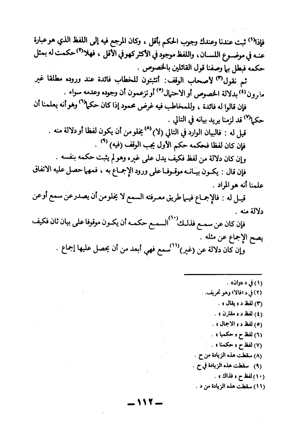 ثُمَّ نَقُولُ لِأَصْحَابِ الْوَقْفِ: أَتُثْبِتُونَ لِلْخِطَابِ فَائِدَةً عِنْدَ وُرُودِهِ مُطْلَقًا غَيْرَ مَقْرُونٍ بِدَلَالَةِ الْخُصُوصِ أَوْ الِاحْتِمَالِ أَوْ تَزْعُمُونَ أَنَّ وُجُودَهُ وَعَدَمَهُ سَوَاءٌ. فَإِنْ قَالُوا لَهُ فَائِدَةٌ، وَلِلْمُخَاطَبِ فِيهِ غَرَضٌ مَحْمُودٌ إذَا كَانَ حُكْمًا وَهُوَ أَنَّهُ يُعَلِّمُنَا أَنَّ حُكْمًا قَدْ لَزِمَنَا يُرِيدُ بَيَانَهُ فِي التَّالِي. قِيلَ لَهُ: فَالْبَيَانُ الْوَارِدُ فِي التَّالِي (لَا) يَخْلُو مِنْ أَنْ يَكُونَ لَفْظًا أَوْ دَلَالَةً مِنْهُ. فَإِنْ كَانَ لَفْظًا فَحُكْمُهُ حُكْمُ الْأَوَّلِ يَجِبُ الْوَقْفُ (فِيهِ) . وَإِنْ كَانَ دَلَالَةً مِنْ لَفْظٍ فَكَيْفَ يَدُلُّ عَلَى غَيْرِهِ وَهُوَ لَمْ يَثْبُتْ حُكْمُهُ بِنَفْسِهِ. فَإِنْ قَالَ: يَكُونُ بَيَانُهُ مَوْقُوفًا عَلَى وُرُودِ الْإِجْمَاعِ بِهِ، فَمَهْمَا حَصَلَ عَلَيْهِ الِاتِّفَاقُ عَلِمْنَا أَنَّهُ هُوَ الْمُرَادُ. قِيلَ لَهُ: فَالْإِجْمَاعُ فِيمَا طَرِيقُ مَعْرِفَتِهِ السَّمْعُ لَا يَخْلُو مِنْ أَنْ يَصْدُرَ عَنْ سَمْعٍ أَوْ عَنْ دَلَالَةٍ مِنْهُ. فَإِنْ كَانَ عَنْ سَمْعٍ فَذَلِكَ السَّمْعُ حُكْمُهُ أَنْ يَكُونَ مَوْقُوفًا عَلَى بَيَانٍ ثَانٍ فَكَيْفَ يَصِحُّ الْإِجْمَاعُ عَنْ مِثْلِهِ. وَإِنْ كَانَ دَلَالَةً عَنْ (غَيْرِ) سَمْعٍ فَهِيَ أَبْعَدُ مِنْ أَنْ يَحْصُلَ عَلَيْهَا إجْمَاعٌ.