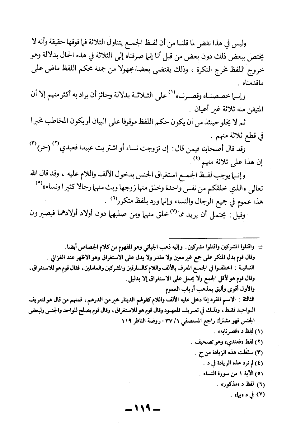 وَلَيْسَ فِي هَذَا نَقْضٌ لِمَا قُلْنَا مِنْ أَنَّ لَفْظَ الْجَمْعِ يَتَنَاوَلُ الثَّلَاثَةَ فَمَا فَوْقَهَا حَقِيقَةً وَأَنَّهُ لَا يَخْتَصُّ بِبَعْضِ ذَلِكَ دُونَ بَعْضٍ مِنْ قِبَلِ أَنَّا إنَّمَا صَرَفْنَاهُ إلَى الثَّلَاثَةِ فِي هَذِهِ الْحَالِ بِدَلَالَةٍ وَهُوَ خُرُوجُ اللَّفْظِ مَخْرَجَ النَّكِرَةِ، وَذَلِكَ يَقْتَضِي بَعْضًا مَجْهُولًا مِنْ جُمْلَةِ مُحْكَمِ اللَّفْظِ مَاضٍ عَلَى مَا قَدَّمْنَاهُ، وَإِنَّمَا خَصَّصْنَاهُ وَقَصَرْنَاهُ عَلَى الثَّلَاثَةِ بِدَلَالَةٍ. وَجَائِزٌ أَنْ يُرَادَ بِهِ أَكْثَرُ مِنْهُمْ إلَّا أَنَّ الْمُتَيَقَّنَ مِنْهُ ثَلَاثَةٌ غَيْرُ أَعْيَانٍ. ثُمَّ لَا يَخْلُو حِينَئِذٍ مِنْ أَنْ يَكُونَ حُكْمُ اللَّفْظِ مَوْقُوفًا عَلَى الْبَيَانِ أَوْ يَكُونُ الْمُخَاطَبُ مُخْبِرًا فِي قَطْعِ ثَلَاثَةٍ مِنْهُمْ. وَقَدْ قَالَ أَصْحَابُنَا فِيمَنْ قَالَ: إنْ تَزَوَّجْت نِسَاءً أَوْ اشْتَرَيْت عَبِيدًا فَعَبْدِي (حُرٌّ) إنَّ هَذَا عَلَى ثَلَاثَةٍ مِنْهُمْ. وَإِنَّمَا يُوجِبُ لَفْظُ الْجَمْعِ اسْتِغْرَاقَ الْجِنْسِ بِدُخُولِ الْأَلِفِ وَاللَّامِ عَلَيْهِ، وَقَدْ قَالَ اللَّهُ تَعَالَى {الَّذِي خَلَقَكُمْ مِنْ نَفْسٍ وَاحِدَةٍ وَخَلَقَ مِنْهَا زَوْجَهَا وَبَثَّ مِنْهُمَا رِجَالًا كَثِيرًا وَنِسَاءً} [النساء: 1] هَذَا عُمُومٌ فِي جَمِيعِ الرِّجَالِ وَالنِّسَاءِ وَإِنَّمَا وَرَدَ بِلَفْظٍ مُتَكَرِّرٍ. وَقِيلَ: يَحْتَمِلُ أَنْ يُرِيدَ مِمَّا خَلَقَ مِنْهُمَا وَمِنْ صُلْبِهِمَا دُونَ أَوْلَادِ أَوْلَادِهِمَا فَيَصِيرُونَ