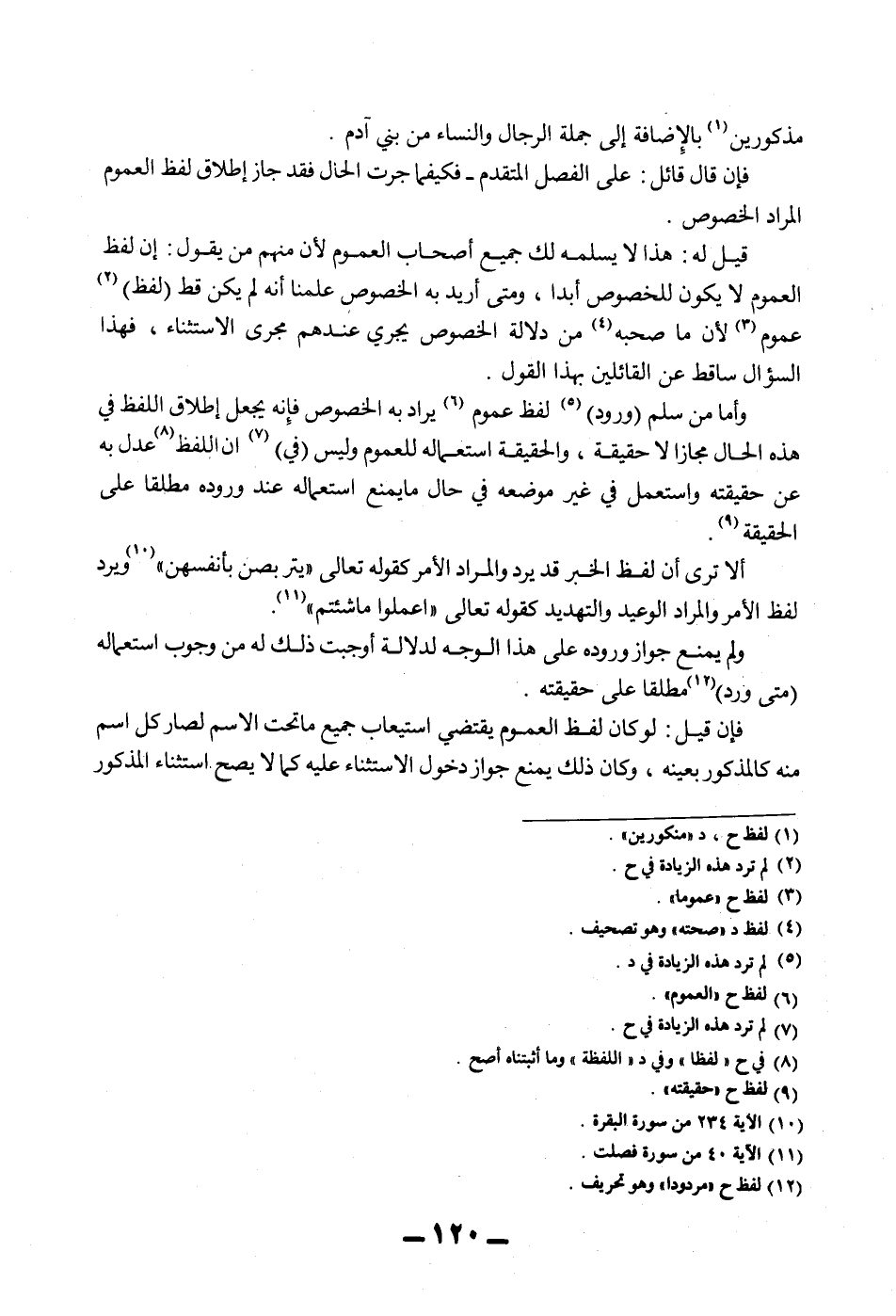 فَإِنْ قَالَ قَائِلٌ: عَلَى الْفَصْلِ الْمُتَقَدِّمِ - فَكَيْفَمَا جَرَتْ الْحَالُ فَقَدْ جَازَ إطْلَاقُ لَفْظِ الْعُمُومِ وَالْمُرَادُ الْخُصُوصُ. قِيلَ لَهُ: هَذَا لَا يُسَلِّمُهُ لَك جَمِيعُ أَصْحَابِ الْعُمُومِ لِأَنَّ مِنْهُمْ مَنْ يَقُولُ: إنَّ لَفْظَ الْعُمُومِ لَا يَكُونُ لِلْخُصُوصِ أَبَدًا، وَمَتَى أُرِيدَ بِهِ الْخُصُوصُ عَلِمْنَا أَنَّهُ لَمْ يَكُنْ قَطُّ (لَفْظَ) عُمُومٍ لِأَنَّ مَا صَحِبَهُ مِنْ دَلَالَةِ الْخُصُوصِ يَجْرِي عِنْدَهُمْ مَجْرَى الِاسْتِثْنَاءِ، فَهَذَا السُّؤَالُ سَاقِطٌ عَنْ الْقَائِلِينَ بِهَذَا الْقَوْلِ. وَأَمَّا مَنْ سَلَّمَ (وُرُودَ) لَفْظِ عُمُومٍ يُرَادُ بِهِ الْخُصُوصُ فَإِنَّهُ يَجْعَلُ إطْلَاقَ اللَّفْظِ فِي هَذِهِ الْحَالِ مَجَازًا لَا حَقِيقَةً، وَالْحَقِيقَةُ اسْتِعْمَالُهُ لِلْعُمُومِ وَلَيْسَ (فِي) أَنَّ اللَّفْظَ عُدِلَ بِهِ عَنْ حَقِيقَتِهِ وَاسْتُعْمِلَ فِي غَيْرِ مَوْضِعِهِ فِي حَالِ مَا يَمْنَعُ اسْتِعْمَالَهُ عُدَّ وُرُودُهُ مُطْلَقًا عَلَى الْحَقِيقَةِ. أَلَا تَرَى أَنَّ لَفْظَ الْخَبَرِ قَدْ يَرِدُ وَالْمُرَادُ الْأَمْرُ كَقَوْلِهِ تَعَالَى {يَتَرَبَّصْنَ بِأَنْفُسِهِنَّ} [البقرة: 228] وَيَرِدُ لَفْظُ الْأَمْرِ وَالْمُرَادُ الْوَعِيدُ وَالتَّهْدِيدُ كَقَوْلِهِ تَعَالَى {اعْمَلُوا مَا شِئْتُمْ} [فصلت: 40] . وَلَمْ يُمْنَعْ جَوَازُ وُرُودِهِ عَلَى هَذَا الْوَجْهِ لِدَلَالَةٍ أَوْجَبَتْ ذَلِكَ لَهُ مِنْ وُجُوبِ اسْتِعْمَالِهِ (مَتَى وَرَدَ) مُطْلَقًا عَلَى حَقِيقَتِهِ. فَإِنْ قِيلَ: لَوْ كَانَ لَفْظُ الْعُمُومِ يَقْتَضِي اسْتِيعَابَ جَمِيعِ مَا تَحْتَ الِاسْمِ لَصَارَ كُلُّ اسْمٍ مِنْهُ كَالْمَذْكُورِ بِعَيْنِهِ، وَكَانَ ذَلِكَ يَمْنَعُ جَوَازَ دُخُولِ الِاسْتِثْنَاءِ عَلَيْهِ كَمَا لَا يَصِحُّ اسْتِثْنَاءُ الْمَذْكُورِ