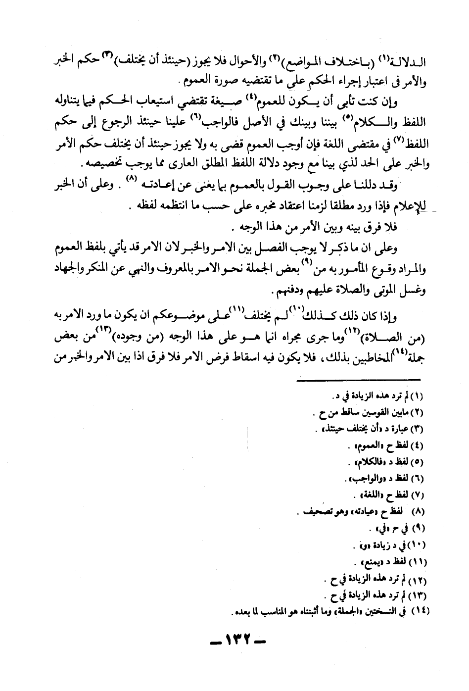 وَإِنْ كُنْت تَأْبَى أَنْ يَكُونَ لِلْعُمُومِ صِيغَةٌ تَقْتَضِي اسْتِيعَابَ الْحُكْمِ فِيمَا يَتَنَاوَلُهُ اللَّفْظُ وَالْكَلَامُ بَيْنَنَا وَبَيْنَك فِي الْأَصْلِ فَالْوَاجِبُ عَلَيْنَا حِينَئِذٍ الرُّجُوعُ إلَى حُكْمِ اللَّفْظِ فِي مُقْتَضَى اللُّغَةِ فَإِنْ أَوْجَبَ الْعُمُومَ قُضِيَ بِهِ وَلَا يَجُوزُ حِينَئِذٍ أَنْ يَخْتَلِفَ حُكْمُ الْأَمْرِ وَالْخَبَرِ عَلَى الْحَدِّ الَّذِي بَيَّنَّا مَعَ وُجُودِ دَلَالَةِ اللَّفْظِ الْمُطْلَقِ الْعَارِي مِمَّا يُوجِبُ تَخْصِيصَهُ. وَقَدْ دَلَّلْنَا عَلَى وُجُوبِ الْقَوْلِ بِالْعُمُومِ بِمَا يُغْنِي عَنْ إعَادَتِهِ. وَعَلَى أَنَّ الْخَبَرَ لِلْإِعْلَامِ فَإِذَا وَرَدَ مُطْلَقًا لَزِمَنَا اعْتِمَادُ مُخْبِرِهِ عَلَى حَسَبِ مَا انْتَظَمَهُ لَفْظُهُ. فَلَا فَرْقَ بَيْنَهُ وَبَيْنَ الْأَمْرِ مِنْ هَذَا الْوَجْهِ. وَعَلَى أَنَّ مَا ذُكِرَ لَا يُوجِبُ الْفَصْلَ بَيْنَ الْأَمْرِ وَالْخَبَرِ لِأَنَّ الْأَمْرَ قَدْ يَأْتِي بِلَفْظِ الْعُمُومِ وَالْمُرَادُ وُقُوعُ الْمَأْمُورِ بِهِ مِنْ بَعْضِ الْجُمْلَةِ نَحْوُ الْأَمْرِ بِالْمَعْرُوفِ وَالنَّهْيِ عَنْ الْمُنْكَرِ وَالْجِهَادِ وَغُسْلِ الْمَوْتَى وَالصَّلَاةِ عَلَيْهِمْ وَدَفْنِهِمْ. وَإِذَا كَانَ ذَلِكَ كَذَلِكَ لَمْ يَخْتَلِفْ عَلَى مَوْضُوعِكُمْ أَنْ يَكُونَ مَا وَرَدَ الْأَمْرُ بِهِ (مِنْ الصَّلَاةِ) وَمَا جَرَى مَجْرَاهُ إنَّمَا هُوَ عَلَى هَذَا الْوَجْهِ (مِنْ وُجُودِهِ) مِنْ بَعْضِ جُمْلَةِ الْمُخَاطَبِينَ بِذَلِكَ، فَلَا يَكُونُ فِيهِ إسْقَاطُ فَرْضِ الْأَمْرِ فَلَا فَرْقَ إذًا بَيْنَ الْأَمْرِ وَالْخَبَرِ مِنْ