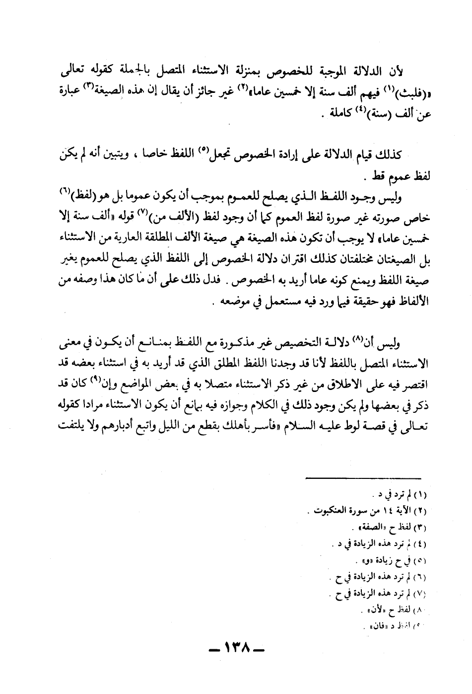 وَلَيْسَ أَنَّ دَلَالَةَ التَّخْصِيصِ غَيْرُ مَذْكُورَةٍ مَعَ اللَّفْظِ بِمَانِعِ أَنْ يَكُونَ فِي مَعْنَى الِاسْتِثْنَاءِ الْمُتَّصِلِ بِاللَّفْظِ لِأَنَّا قَدْ وَجَدْنَا اللَّفْظَ الْمُطْلَقَ الَّذِي قَدْ أُرِيدَ بِهِ فِي اسْتِثْنَاءِ بَعْضِهِ قَدْ اُقْتُصِرَ فِيهِ عَلَى الْإِطْلَاقِ مِنْ غَيْرِ ذِكْرِ الِاسْتِثْنَاءِ مُتَّصِلًا بِهِ فِي بَعْضِ الْمَوَاضِعِ وَإِنْ كَانَ قَدْ ذُكِرَ فِي بَعْضِهَا وَلَمْ يَكُنْ وُجُودُ ذَلِكَ فِي الْكَلَامِ وَجَوَازُهُ فِيهِ بِمَانِعٍ أَنْ يَكُونَ الِاسْتِثْنَاءُ مُرَادًا كَقَوْلِهِ تَعَالَى فِي قِصَّةِ لُوطٍ - عَلَيْهِ السَّلَامُ - {فَأَسْرِ بِأَهْلِكَ بِقِطْعٍ مِنْ اللَّيْلِ وَاتَّبِعْ أَدْبَارَهُمْ وَلَا يَلْتَفِتْ