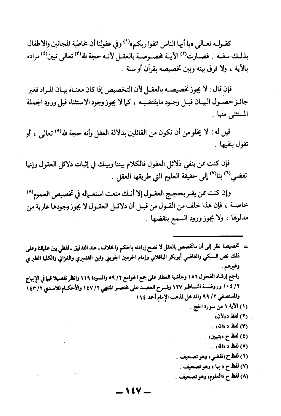 كَقَوْلِهِ تَعَالَى {يَا أَيُّهَا النَّاسُ اتَّقُوا رَبَّكُمْ} [النساء: 1] وَفِي عُقُولِنَا أَنَّ مُخَاطَبَةَ الْمَجَانِينِ وَالْأَطْفَالِ بِذَلِكَ سَفَهٌ. فَصَارَتْ الْآيَةُ مَخْصُوصَةً بِالْعَقْلِ لِأَنَّهُ حُجَّةُ لِلَّهِ تَعَالَى تُبَيِّنُ مُرَادَهُ بِالْآيَةِ، وَلَا فَرْقَ بَيْنَهُ وَبَيْنَ تَخْصِيصِهِ بِقُرْآنٍ أَوْ سُنَّةٍ. فَإِنْ قَالَ: لَا يَجُوزُ تَخْصِيصُهُ بِالْعَقْلِ لِأَنَّ التَّخْصِيصَ إذَا كَانَ مَعْنَاهُ بَيَانَ الْمُرَادِ فَغَيْرُ جَائِزٍ حُصُولُ الْبَيَانِ قَبْلَ وُجُودِ مَا يَقْتَضِيهِ، كَمَا لَا يَجُوزُ وُجُودُ الِاسْتِثْنَاءِ قَبْلَ وُرُودِ الْجُمْلَةِ الْمُسْتَثْنَى مِنْهَا. قِيلَ لَهُ: لَا يَخْلُو مِنْ أَنْ تَكُونَ مِنْ الْقَائِلِينَ بِدَلَالَةِ الْعَقْلِ وَأَنَّهُ حُجَّةٌ لِلَّهِ تَعَالَى، أَوْ تَقُولَ بِنَفْيِهَا. فَإِنْ كُنْت مِمَّنْ يَنْفِي دَلَائِلَ الْعُقُولِ فَالْكَلَامُ بَيْنَنَا وَبَيْنَك فِي إثْبَاتِ دَلَائِلِ الْعُقُولِ وَأَنَّهَا تُفْضِي بِنَا إلَى حَقِيقَةِ الْعُلُومِ الَّتِي طَرِيقُهَا الْعَقْلُ. وَإِنْ كُنْت مِمَّنْ يُقِرُّ بِحُجَجِ الْعُقُولِ إلَّا أَنَّك مَنَعَتْ اسْتِعْمَالَهُ فِي تَخْصِيصِ الْعُمُومِ خَاصَّةً، فَإِنَّ هَذَا خُلْفٌ مِنْ الْقَوْلِ مِنْ قِبَلِ أَنَّ دَلَائِلَ الْعُقُولِ لَا يَجُوزُ وُجُودُهَا عَارِيَّةً مِنْ مَدْلُولِهَا، وَلَا يَجُوزُ وُرُودُ السَّمْعِ بِنَقْضِهَا.