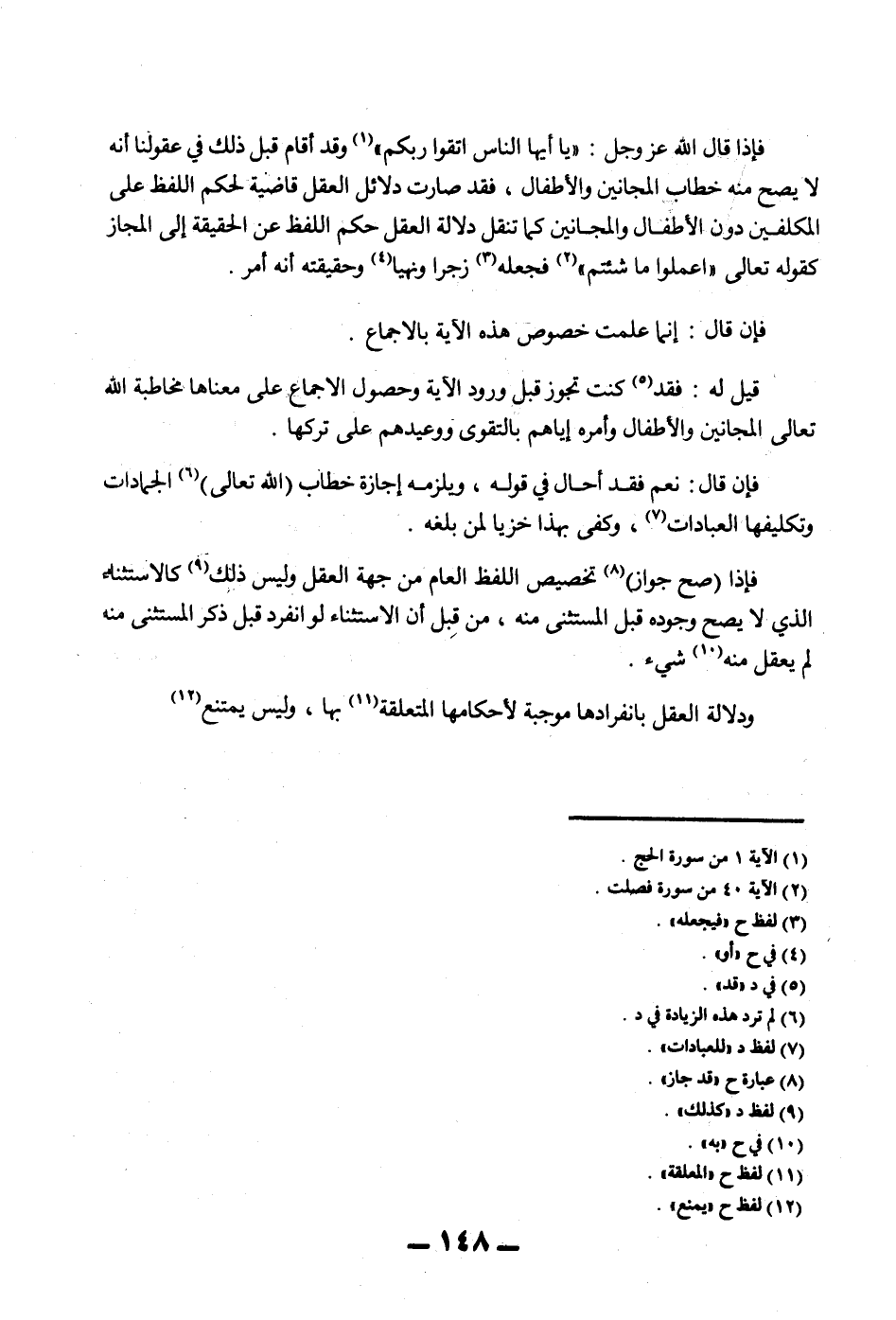 فَإِذَا قَالَ اللَّهُ عَزَّ وَجَلَّ: {يَا أَيُّهَا النَّاسُ اتَّقُوا رَبَّكُمْ} [النساء: 1] وَقَدْ أَقَامَ قَبْلَ ذَلِكَ فِي عُقُولِنَا أَنَّهُ لَا يَصِحُّ مِنْهُ خِطَابُ الْمَجَانِينِ وَالْأَطْفَالِ، فَقَدْ صَارَتْ دَلَائِلُ الْعَقْلِ قَاضِيَةً لِحُكْمِ اللَّفْظِ عَلَى الْمُكَلَّفِينَ دُونَ الْأَطْفَالِ وَالْمَجَانِينِ كَمَا تَنْقُلُ دَلَالَةُ الْعَقْلِ حُكْمَ اللَّفْظِ عَنْ الْحَقِيقَةِ إلَى الْمَجَازِ كَقَوْلِهِ تَعَالَى {اعْمَلُوا مَا شِئْتُمْ} [فصلت: 40] فَجَعَلَهُ زَجْرًا وَنَهْيًا وَحَقِيقَتُهُ أَنَّهُ أَمْرٌ. فَإِنْ قَالَ: إنَّمَا عَلِمْت خُصُوصَ هَذِهِ الْآيَةِ بِالْإِجْمَاعِ. قِيلَ لَهُ: فَقَدْ كُنْت تُجَوِّزُ قَبْلَ وُرُودِ الْآيَةِ وَحُصُولِ الْإِجْمَاعِ عَلَى مَعْنَاهَا مُخَاطَبَةَ اللَّهِ تَعَالَى الْمَجَانِينَ وَالْأَطْفَالَ وَأَمْرَهُ إيَّاهُمْ بِالتَّقْوَى وَوَعِيدَهُمْ عَلَى تَرْكِهَا. فَإِنْ قَالَ: نَعَمْ فَقَدْ أَحَالَ فِي قَوْلِهِ، وَيَلْزَمُهُ إجَازَةُ خِطَابِ (اللَّهِ تَعَالَى) الْجَمَادَاتِ وَتَكْلِيفِهَا الْعِبَادَاتِ، وَكَفَى بِهَذَا خِزْيًا لِمَنْ بَلَغَهُ.