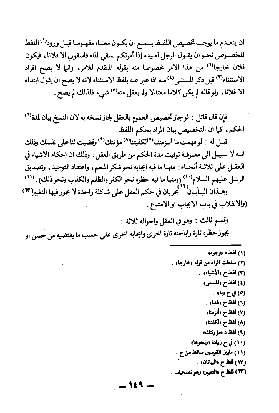 فَإِنْ قَالَ قَائِلٌ: لَوْ جَازَ تَخْصِيصُ الْعُمُومِ بِالْعَقْلِ لَجَازَ نَسْخُهُ بِهِ لِأَنَّ النَّسْخَ بَيَانٌ لِمُدَّةِ الْحُكْمِ، كَمَا أَنَّ التَّخْصِيصَ بَيَانُ الْمُرَادِ بِحُكْمِ اللَّفْظِ. قِيلَ لَهُ: لَوْ فَهِمْت مَا أَلْزَمْتنَا لَكَفَيْتنَا مُؤْنَتَك وَقَضَيْت لَنَا عَلَى نَفْسِك وَذَلِكَ أَنَّهُ لَا سَبِيلَ إلَى مَعْرِفَةِ تَوْقِيتِ مُدَّةِ الْحُكْمِ مِنْ طَرِيقِ الْعَقْلِ، وَذَلِكَ أَنَّ أَحْكَامَ الْأَشْيَاءِ فِي الْعَقْلِ عَلَى ثَلَاثَةِ أَنْحَاءٍ: مِنْهَا مَا فِيهِ إيجَابُهُ نَحْوُ شُكْرِ الْمُنْعِمِ، وَاعْتِقَادِ التَّوْحِيدِ، وَتَصْدِيقِ الرُّسُلِ - عَلَيْهِمْ السَّلَامُ - (وَمِنْهَا مَا فِيهِ حَظْرُهُ نَحْوُ الْكُفْرِ وَالظُّلْمِ وَالْكَذِبِ وَنَحْوِ ذَلِكَ) .