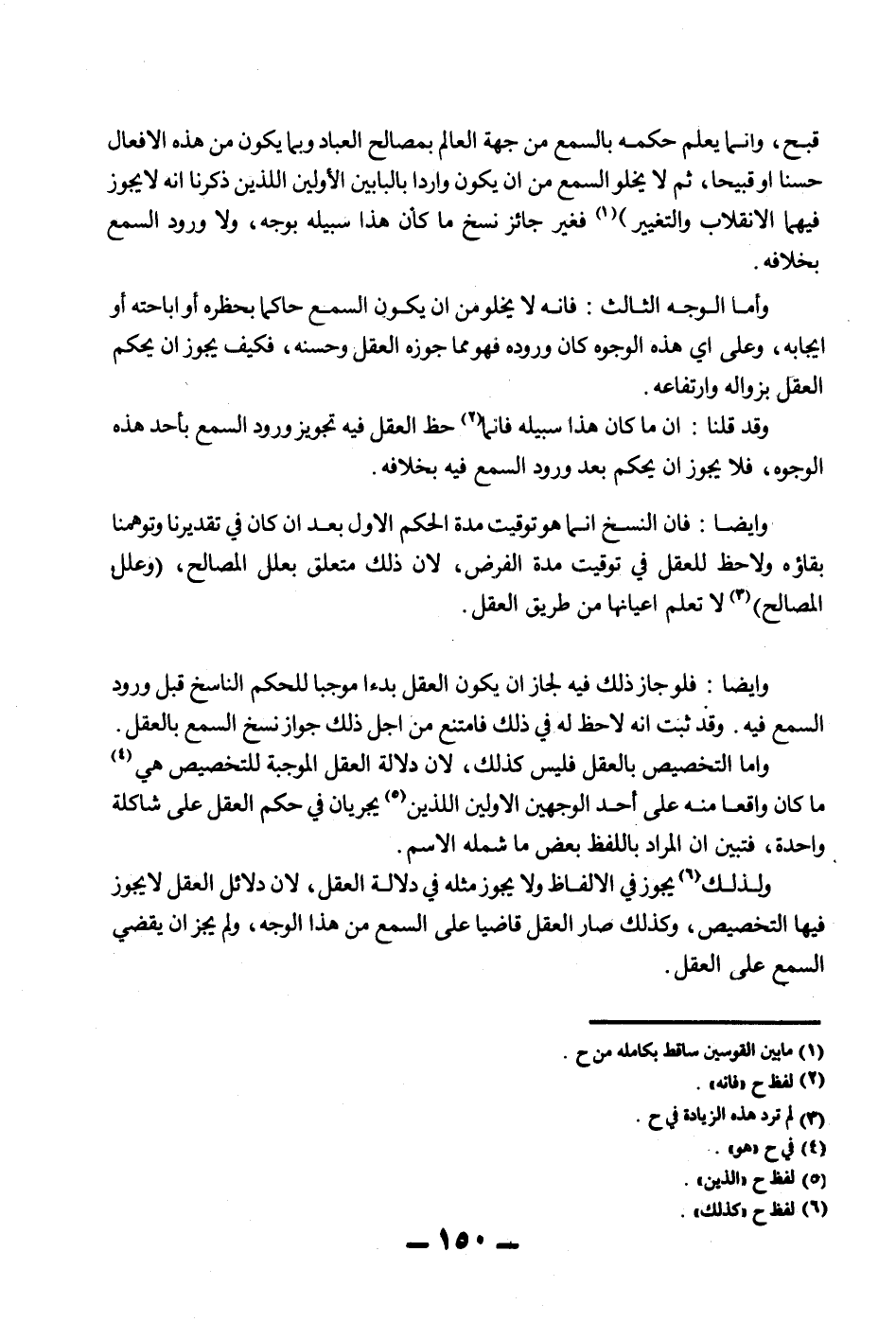 قُبْحٍ، وَإِنَّمَا يُعْلَمُ حُكْمُهُ بِالسَّمْعِ مِنْ جِهَةِ الْعَالِمِ بِمَصَالِحِ الْعِبَادِ وَبِمَا يَكُونُ مِنْ هَذِهِ الْأَفْعَالِ حَسَنًا أَوْ قَبِيحًا، ثُمَّ لَا يَخْلُو السَّمْعُ مِنْ أَنْ يَكُونَ وَارِدًا بِالْبَابَيْنِ الْأَوَّلَيْنِ اللَّذَيْنِ ذَكَرْنَا أَنَّهُ لَا يَجُوزُ فِيهِمَا الِانْقِلَابُ وَالتَّغَيُّرُ) فَغَيْرُ جَائِزٍ نَسْخُ مَا كَانَ هَذَا سَبِيلُهُ بِوَجْهٍ، وَلَا وُرُودُ السَّمْعِ بِخِلَافِهِ. وَأَمَّا الْوَجْهُ الثَّالِثُ: فَإِنَّهُ لَا يَخْلُو مِنْ أَنْ يَكُونَ السَّمْعُ حَاكِمًا بِحَظْرِهِ أَوْ إبَاحَتِهِ أَوْ إيجَابِهِ، وَعَلَى أَيِّ هَذِهِ الْوُجُوهِ كَانَ وُرُودُهُ فَهُوَ مِمَّا جَوَّزَهُ الْعَقْلُ وَحَسَّنَهُ، فَكَيْفَ يَجُوزُ أَنْ يَحْكُمَ الْعَقْلُ بِزَوَالِهِ وَارْتِفَاعِهِ. وَقَدْ قُلْنَا: إنَّ مَا كَانَ هَذَا سَبِيلَهُ فَإِنَّمَا حَظُّ الْعَقْلِ فِيهِ تَجْوِيزُ وُرُودِ السَّمْعِ بِأَحَدِ هَذِهِ الْوُجُوهِ، فَلَا يَجُوزُ أَنْ يَحْكُمَ بَعْدَ وُرُودِ السَّمْعِ فِيهِ بِخِلَافِهِ.