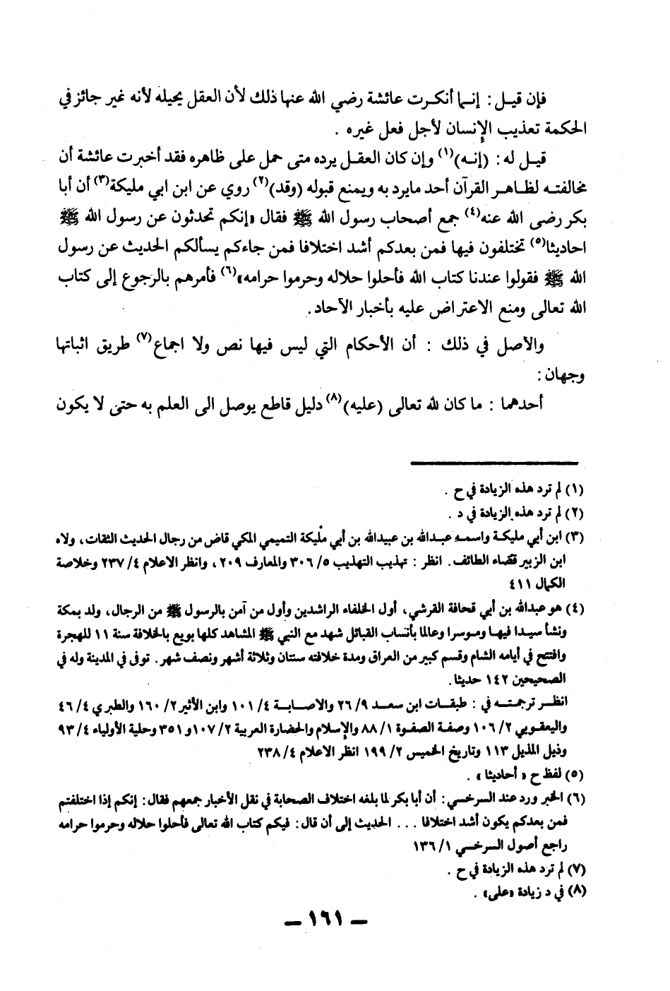 فَإِنْ قِيلَ: إنَّمَا أَنْكَرَتْ عَائِشَةُ - رَضِيَ اللَّهُ عَنْهَا - ذَلِكَ لِأَنَّ الْعَقْلَ يُحِيلُهُ لِأَنَّهُ غَيْرُ جَائِزٍ فِي الْحِكْمَةِ تَعْذِيبُ الْإِنْسَانِ لِأَجْلِ فِعْلِ غَيْرِهِ. قِيلَ لَهُ: (إنَّهُ) وَإِنْ كَانَ الْعَقْلُ يَرُدُّهُ مَتَى حُمِلَ عَلَى ظَاهِرِهِ فَقَدْ أَخْبَرَتْ عَائِشَةُ أَنَّ مُخَالَفَتَهُ لِظَاهِرِ الْقُرْآنِ أَحَدُ مَا يُرَدُّ بِهِ وَيَمْنَعُ قَبُولَهُ (وَقَدْ) رُوِيَ عَنْ ابْنِ أَبِي مُلَيْكَةَ أَنَّ أَبَا بَكْرٍ - رَضِيَ اللَّهُ عَنْهُ - جَمَعَ أَصْحَابَ رَسُولِ اللَّهِ - صَلَّى اللَّهُ عَلَيْهِ وَسَلَّمَ - فَقَالَ " إنَّكُمْ تُحَدِّثُونَ عَنْ رَسُولِ اللَّهِ - صَلَّى اللَّهُ عَلَيْهِ وَسَلَّمَ - أَحَادِيثَ تَخْتَلِفُونَ فِيهَا فَمَنْ بَعْدَكُمْ أَشَدُّ اخْتِلَافًا فَمَنْ جَاءَكُمْ يَسْأَلُكُمْ الْحَدِيثَ عَنْ رَسُولِ اللَّهِ - صَلَّى اللَّهُ عَلَيْهِ وَسَلَّمَ - فَقُولُوا عِنْدَنَا كِتَابُ اللَّهِ فَأَحِلُّوا حَلَالَهُ وَحَرِّمُوا حَرَامَهُ " فَأَمَرَهُمْ بِالرُّجُوعِ إلَى كِتَابِ اللَّهِ تَعَالَى وَمَنَعَ الِاعْتِرَاضَ عَلَيْهِ بِأَخْبَارِ الْآحَادِ.