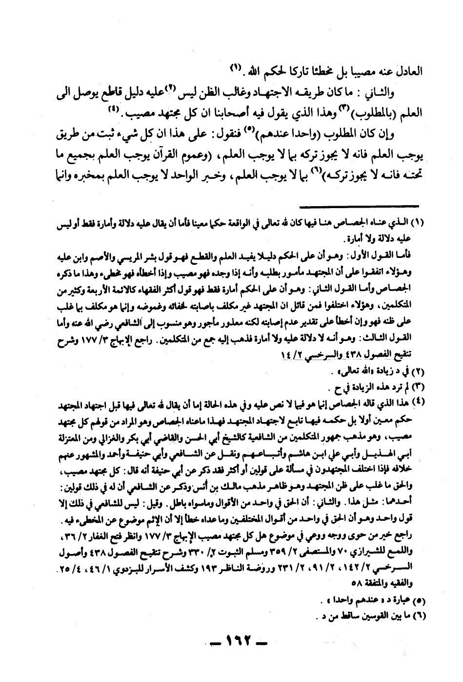 الْعَادِلُ عَنْهُ مُصِيبًا بَلْ مُخْطِئًا تَارِكًا لِحُكْمِ اللَّهِ وَالثَّانِي: مَا كَانَ طَرِيقُهُ الِاجْتِهَادَ وَغَالِبُ الظَّنِّ لَيْسَ عَلَيْهِ دَلِيلٌ قَاطِعٌ يُوَصِّلُ إلَى الْعِلْمِ (بِالْمَطْلُوبِ) وَهَذَا الَّذِي يَقُولُ فِيهِ أَصْحَابُنَا إنَّ كُلَّ مُجْتَهِدٍ مُصِيبٌ وَإِنْ كَانَ الْمَطْلُوبُ (وَاحِدًا عِنْدَهُمْ) فَنَقُولُ: عَلَى هَذَا أَنَّ كُلَّ شَيْءٍ ثَبَتَ مِنْ طَرِيقٍ يُوجِبُ الْعِلْمَ فَإِنَّهُ لَا يَجُوزُ تَرْكُهُ بِمَا لَا يُوجِبُ الْعِلْمَ.
