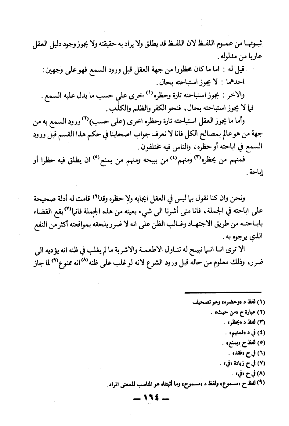 ثُبُوتِهَا مِنْ عُمُومِ اللَّفْظِ لِأَنَّ اللَّفْظَ قَدْ يُطْلَقُ وَلَا يُرَادُ بِهِ حَقِيقَتُهُ وَلَا يَجُوزُ وُجُودُ دَلِيلِ الْعَقْلِ عَارِيًّا مِنْ مَدْلُولِهِ. قِيلَ لَهُ: أَمَّا مَا كَانَ مَحْظُورًا مِنْ جِهَةِ الْعَقْلِ قَبْلَ وُرُودِ السَّمْعِ فَهُوَ عَلَى وَجْهَيْنِ: أَحَدُهُمَا: لَا يَجُوزُ اسْتِبَاحَتُهُ بِحَالٍ. وَالْآخَرُ: يَجُوزُ اسْتِبَاحَتُهُ تَارَةً وَحَظْرُهُ أُخْرَى عَلَى حَسَبِ مَا يَدُلُّ عَلَيْهِ السَّمْعُ. فَمَا لَا يَجُوزُ اسْتِبَاحَتُهُ بِحَالٍ، فَنَحْوُ الْكُفْرِ وَالظُّلْمِ وَالْكَذِبِ. وَأَمَّا مَا يُجَوِّزُ الْعَقْلُ اسْتِبَاحَتَهُ تَارَةً وَحَظْرَهُ أُخْرَى (عَلَى حَسَبِ) وُرُودِ السَّمْعِ بِهِ مِنْ جِهَةِ مَنْ هُوَ عَالِمٌ بِمَصَالِحِ الْكُلِّ فَإِنَّا لَا نَعْرِفُ جَوَابَ أَصْحَابِنَا فِي حُكْمِ هَذَا الْقِسْمِ قَبْلَ وُرُودِ السَّمْعِ فِي إبَاحَتِهِ أَوْ حَظْرِهِ، وَالنَّاسُ فِيهِ مُخْتَلِفُونَ. فَمِنْهُمْ مَنْ يَحْظُرُهُ وَمِنْهُمْ مَنْ يُبِيحُهُ وَمِنْهُمْ مَنْ يَمْنَعُ أَنْ يُطْلِقَ فِيهِ حَظْرًا أَوْ إبَاحَةً.