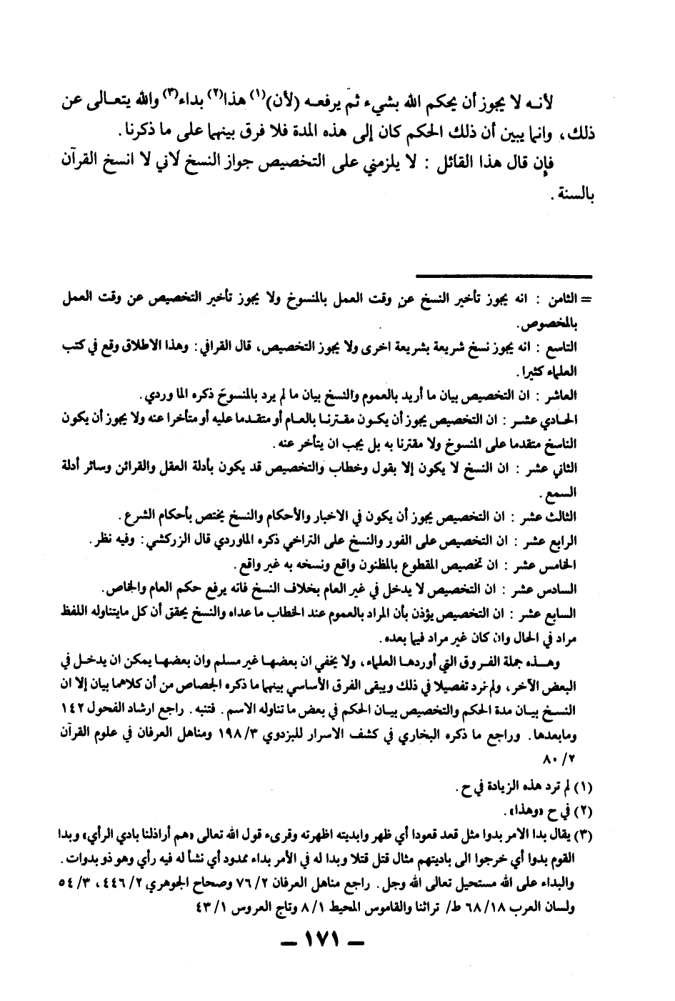 لِأَنَّهُ لَا يَجُوزُ أَنْ يَحْكُمَ اللَّهُ بِشَيْءٍ ثُمَّ يَرْفَعَهُ (لِأَنَّ) هَذَا بَدَاءٌ، وَاَللَّهُ يَتَعَالَى عَنْ ذَلِكَ، وَإِنَّمَا يُبَيِّنُ أَنَّ ذَلِكَ الْحُكْمَ كَانَ إلَى هَذِهِ الْمُدَّةِ فَلَا فَرْقَ بَيْنَهُمَا عَلَى مَا ذَكَرْنَا. فَإِنْ قَالَ هَذَا الْقَائِلُ: لَا يَلْزَمُنِي عَلَى التَّخْصِيصِ جَوَازُ النَّسْخِ لِأَنِّي لَا أَنْسَخُ الْقُرْآنَ بِالسُّنَّةِ.